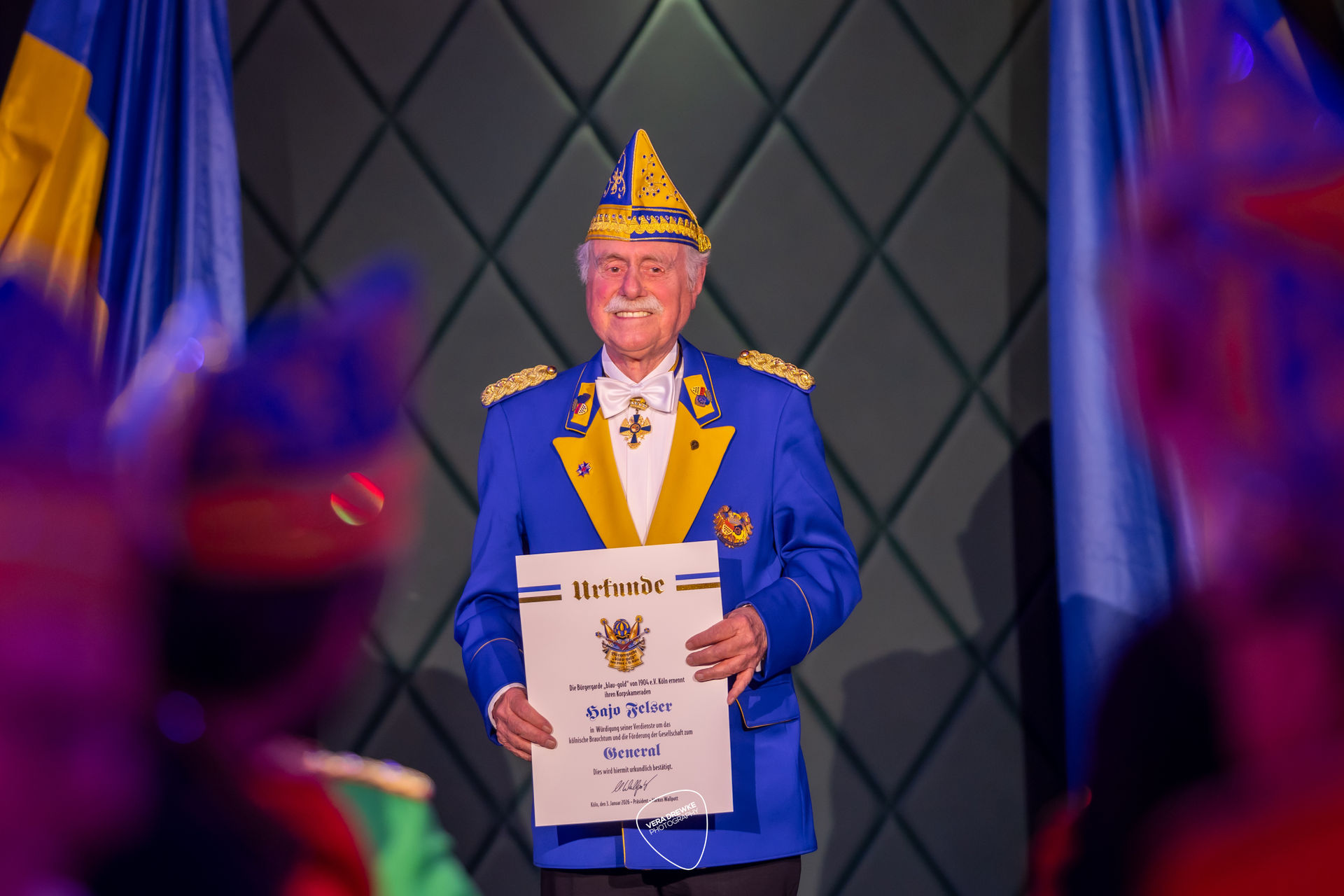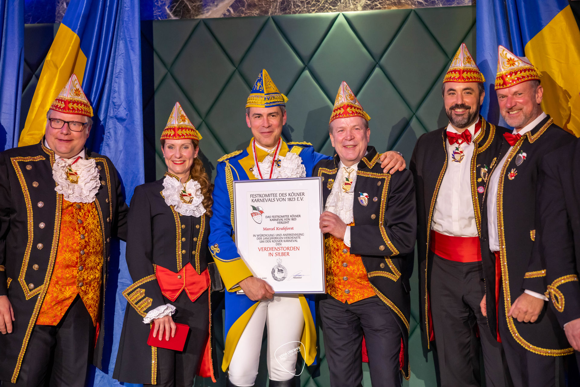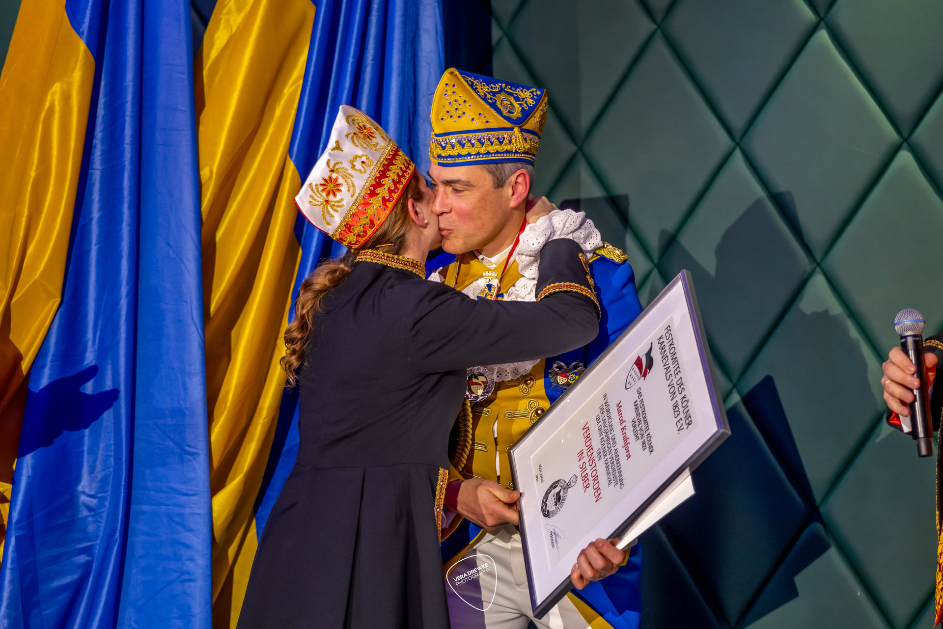 Ein emotionaler Höhepunkt des Abends war die doppelte Auszeichnung von Marcel Krahforst. Zunächst erhielt er die Spange in Gold, bevor ihm anschließend vom Festkomitee der auch noch der Verdienstorden in Silber für seine ehrenamtlichen Verdienste um den Kölner Karnevalkommt von „Carne vale! Fleisch, lebe wohl!“und bringt den Charakter des Festes als Freudenfest vor der langen Fastenzeit zum Ausdruck bringt. More verliehen wurde. Überreicht wurde diese Auszeichnung mit einem ganz besonderen Moment: seine Frau Nadine Krahforst stand zusammen mit ihren FK-Vorstandskollegen auf der Bühne und überreichte ihm den Ordenwerden auch im Karneval als Anerkennung für besondere Verdienste verliehen. Freunde und Förderer der Gesellschaften, Künstler, illustre Gäste und edle Spender werden mit Orden ausgezeichnet, aber auch jeder Jeck kann sich selber einen Sessionsorden kaufen. Sollten Orden in den Anfängen einmal die Ordensflut der preußischen Obrigkeit persiflieren, sind sie inzwischen zu begehrten Sammlerobjekten geworden. Denn die Karnevalsgesellschaften haben den Ehrgeiz, jedes Jahr künstlerisch wertvolle und aktuelle Exemplare zu entwickeln, und so gibt es in jeder Session eine Vielzahl an bunt schillernden Orden. Besonders begehrt ist die P... More – von Christoph Kuckelkorn hätte er vermutlich keinen Kuss dazu bekommen :-p