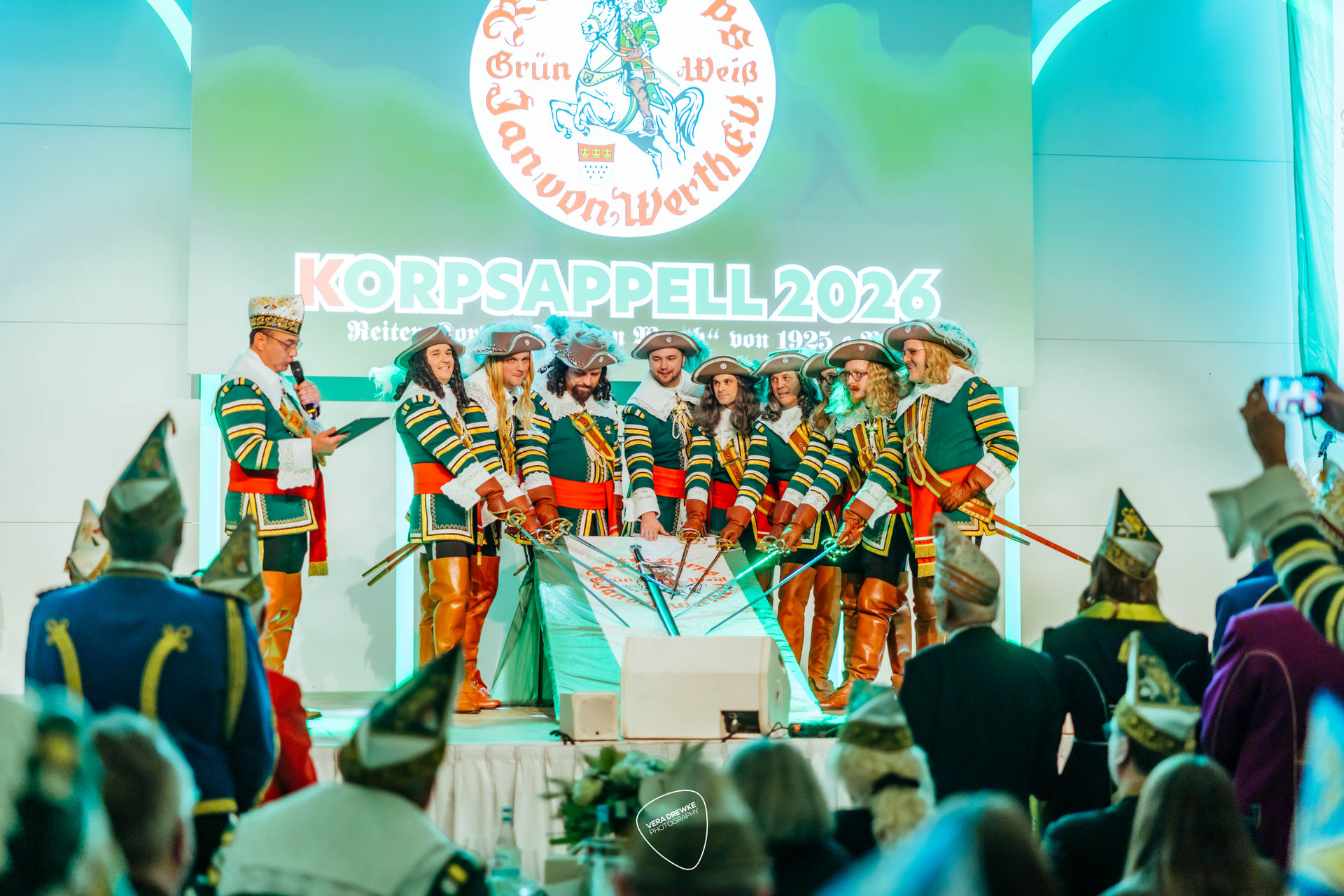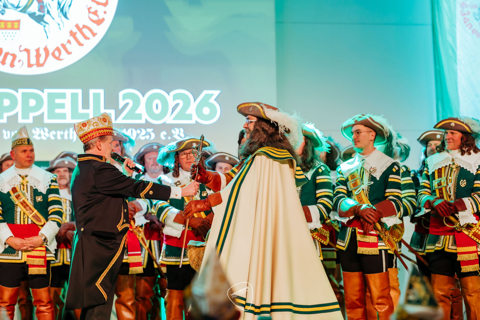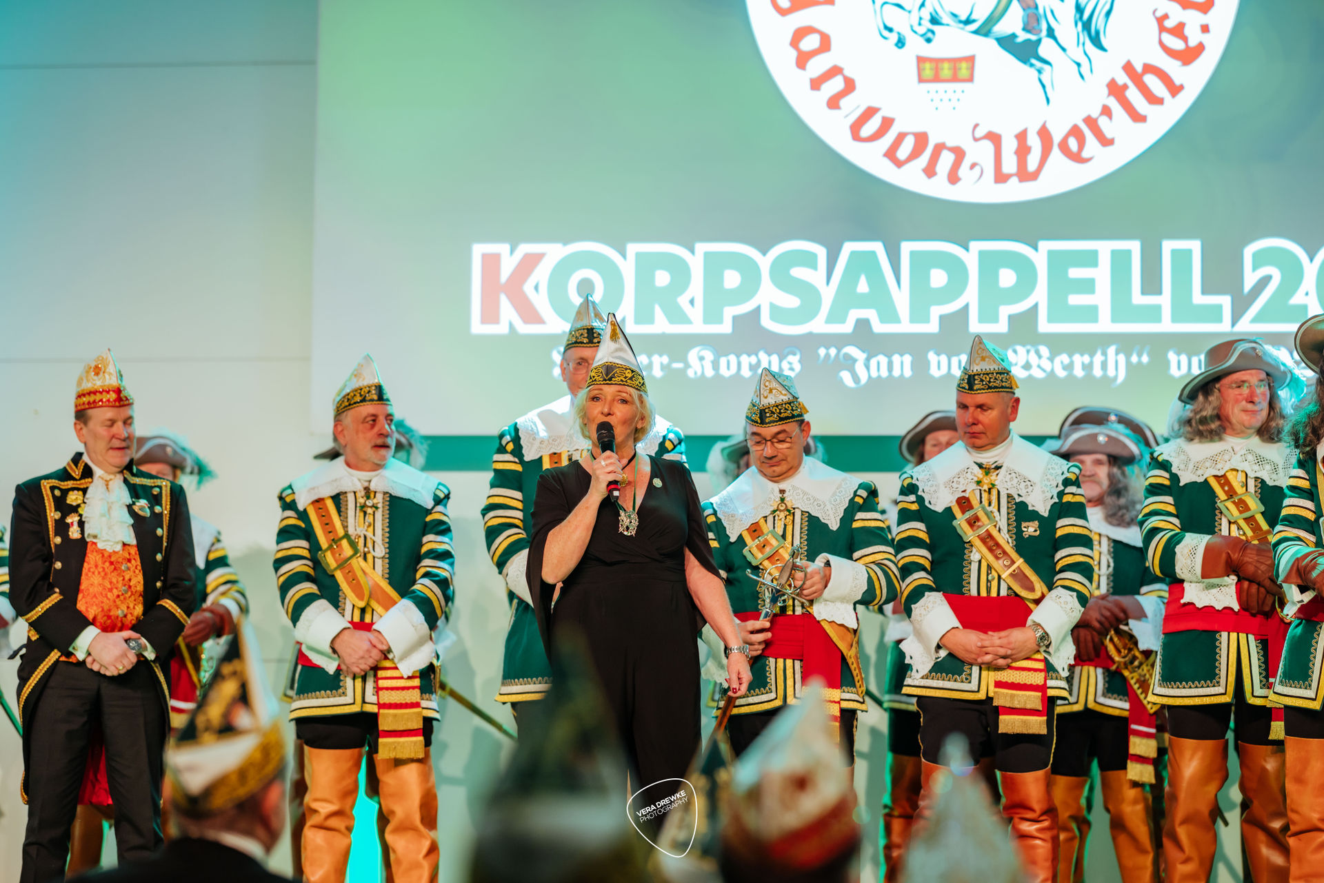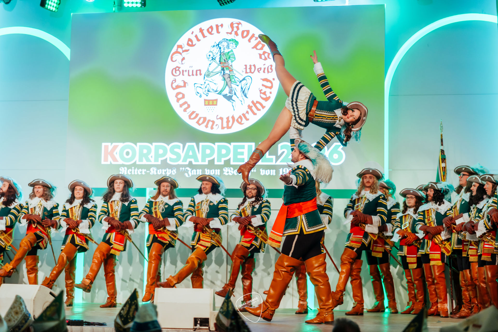 „Warum hast du nicht ja gesagt?“, schmettert Horst-Peter Becker ins Mikrophon, während Melanie Becker lächend über die Bühne tanzt. Ein Musical in der Flora? Nein -es ist Korpsappelloder auch Regimentsappell ist eine jecke Persiflage auf die militärische Tradition der Appelle. Jedes Traditionskorps veranstaltet zu Beginn der Session einen solchen Appell mit geladenen Gästen, bei der die Mitglieder auf ihre Sessionstauglichkeit „geprüft", neue Mitglieder vereidigt, Beförderungen ausgesprochen und Ehrenmitglieder ernannt werden. Für das Tanzpaar, das Tanzkorps und die Musikkapelle ist es ein Art Generalprobe, denn sie haben hier mit ihrem Tanz bzw. ihrer Musik den ersten Auftritt in der Session. More des Reiter-Korps „Jan von Werth“ von 1925 e.V., bei dem zugleich das Jan und Griet Paar 2026 proklamiert wird.