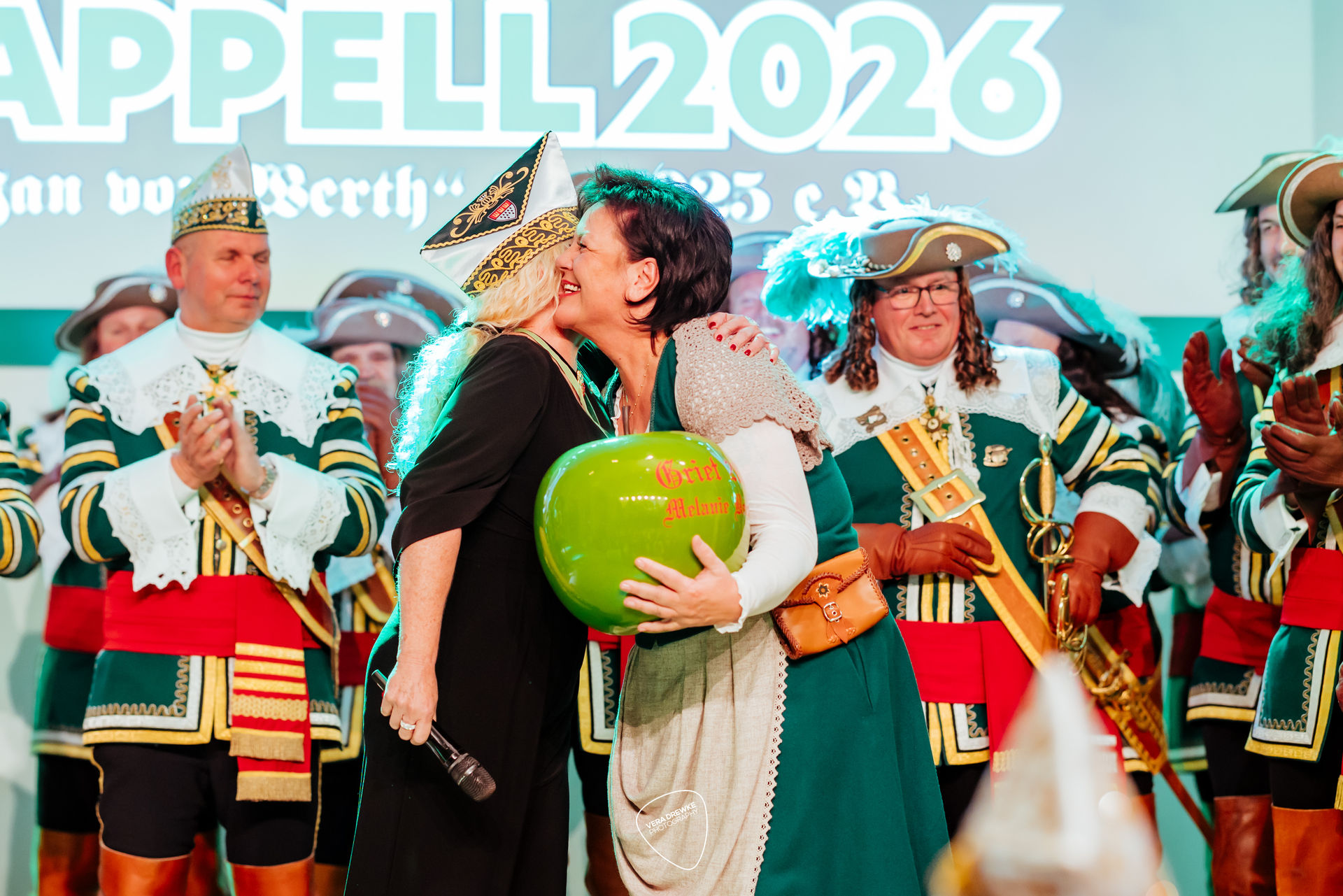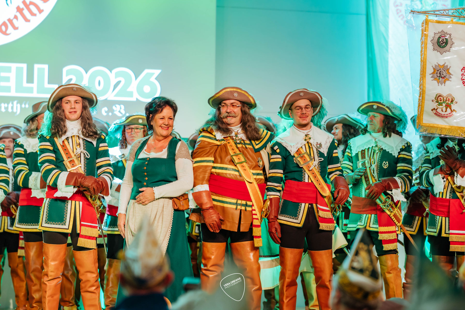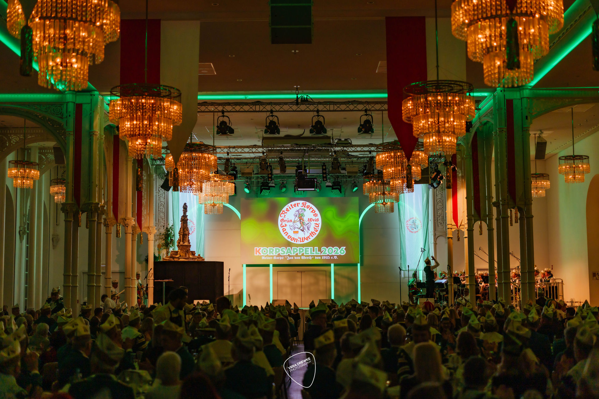 „Warum hast du nicht ja gesagt?“, schmettert Horst-Peter Becker ins Mikrophon, während Melanie Becker lächend über die Bühne tanzt. Ein Musical in der Flora? Nein -es ist Korpsappelloder auch Regimentsappell ist eine jecke Persiflage auf die militärische Tradition der Appelle. Jedes Traditionskorps veranstaltet zu Beginn der Session einen solchen Appell mit geladenen Gästen, bei der die Mitglieder auf ihre Sessionstauglichkeit „geprüft", neue Mitglieder vereidigt, Beförderungen ausgesprochen und Ehrenmitglieder ernannt werden. Für das Tanzpaar, das Tanzkorps und die Musikkapelle ist es ein Art Generalprobe, denn sie haben hier mit ihrem Tanz bzw. ihrer Musik den ersten Auftritt in der Session. More des Reiter-Korps „Jan von Werth“ von 1925 e.V., bei dem zugleich das Jan und Griet Paar 2026 proklamiert wird.