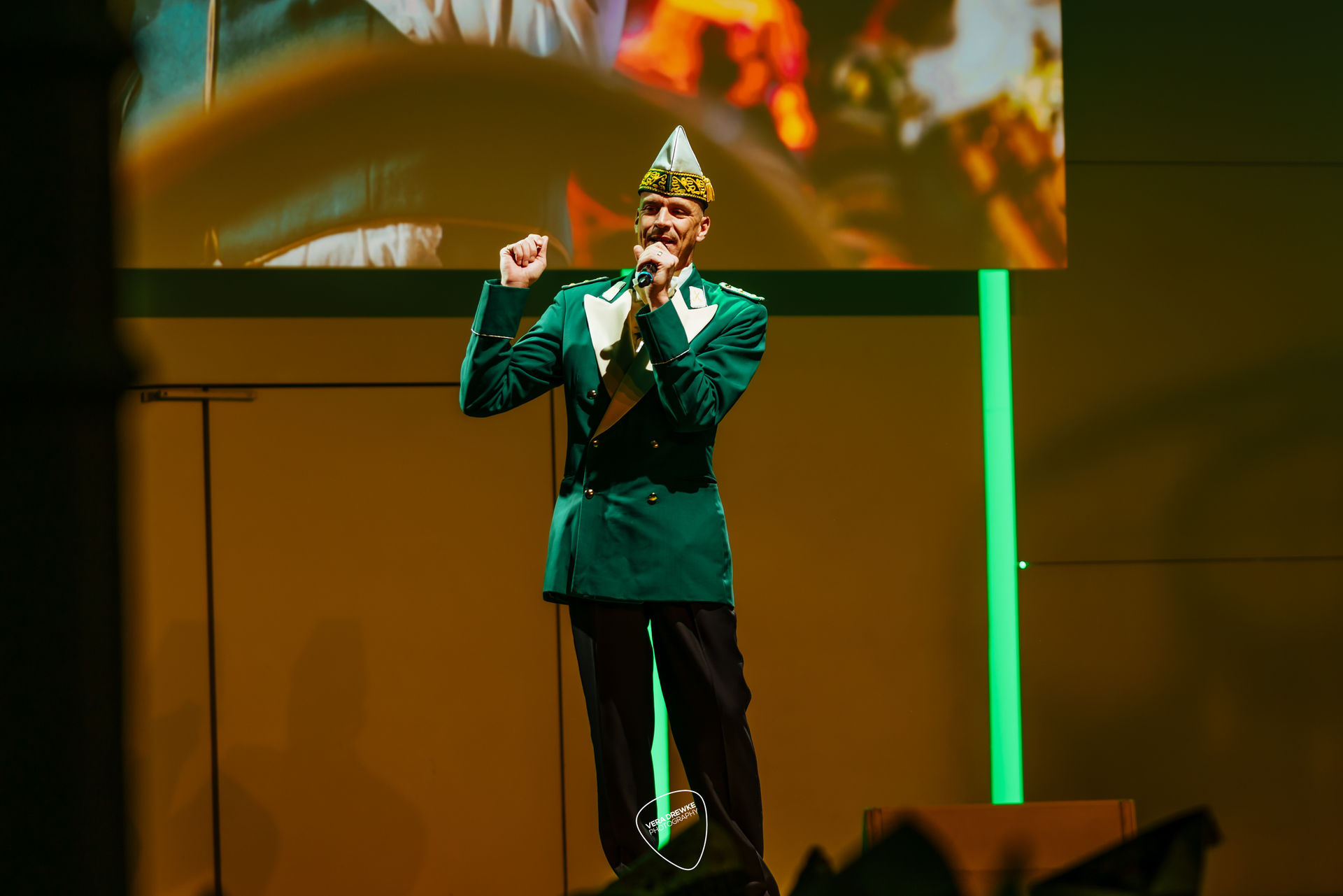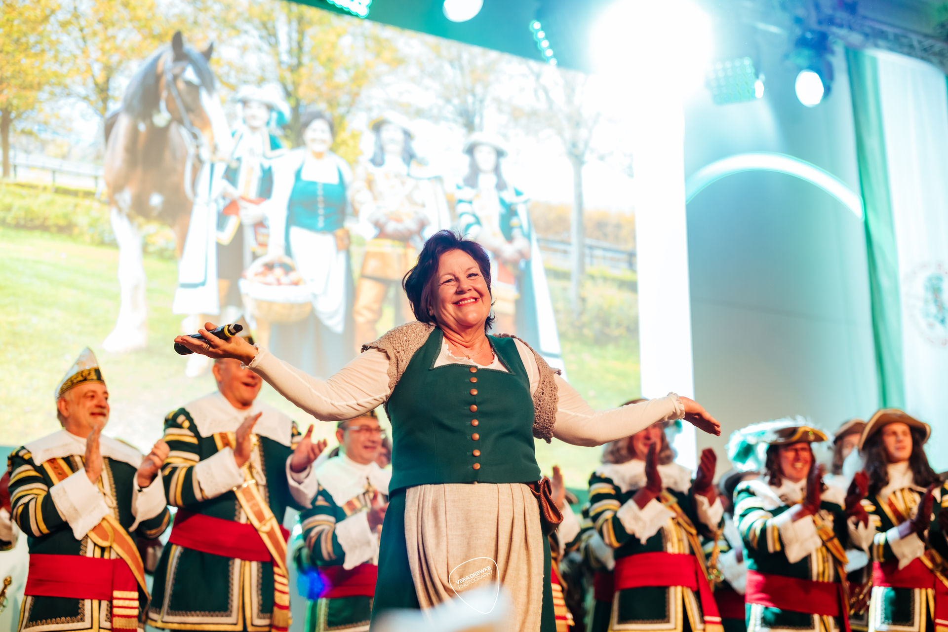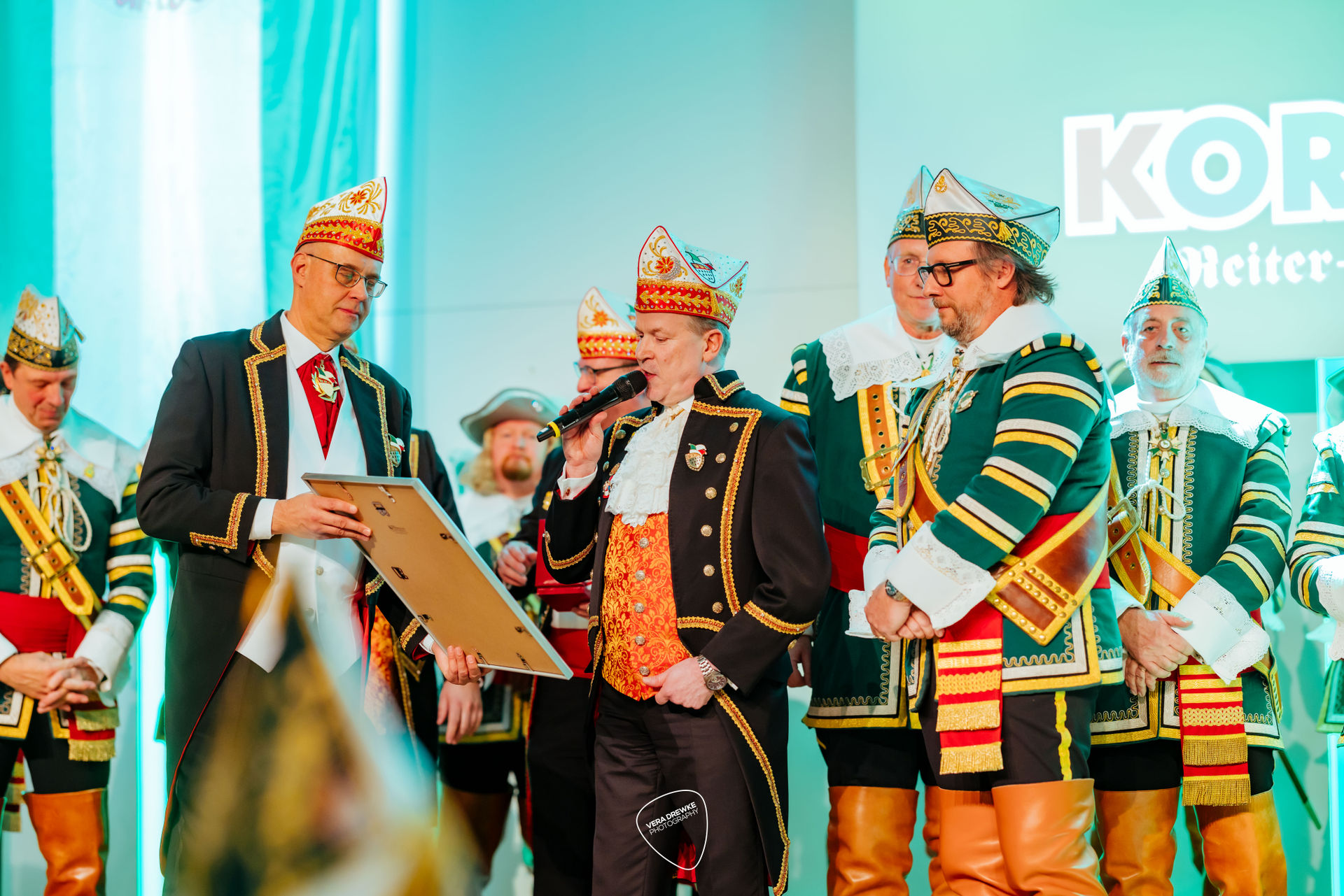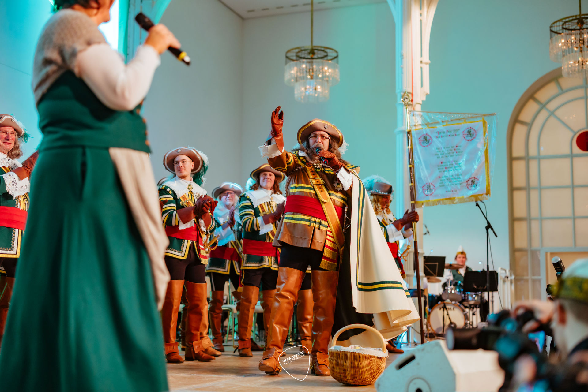 „Warum hast du nicht ja gesagt?“, schmettert Horst-Peter Becker ins Mikrophon, während Melanie Becker lächend über die Bühne tanzt. Ein Musical in der Flora? Nein -es ist Korpsappelloder auch Regimentsappell ist eine jecke Persiflage auf die militärische Tradition der Appelle. Jedes Traditionskorps veranstaltet zu Beginn der Session einen solchen Appell mit geladenen Gästen, bei der die Mitglieder auf ihre Sessionstauglichkeit „geprüft", neue Mitglieder vereidigt, Beförderungen ausgesprochen und Ehrenmitglieder ernannt werden. Für das Tanzpaar, das Tanzkorps und die Musikkapelle ist es ein Art Generalprobe, denn sie haben hier mit ihrem Tanz bzw. ihrer Musik den ersten Auftritt in der Session. More des Reiter-Korps „Jan von Werth“ von 1925 e.V., bei dem zugleich das Jan und Griet Paar 2026 proklamiert wird.