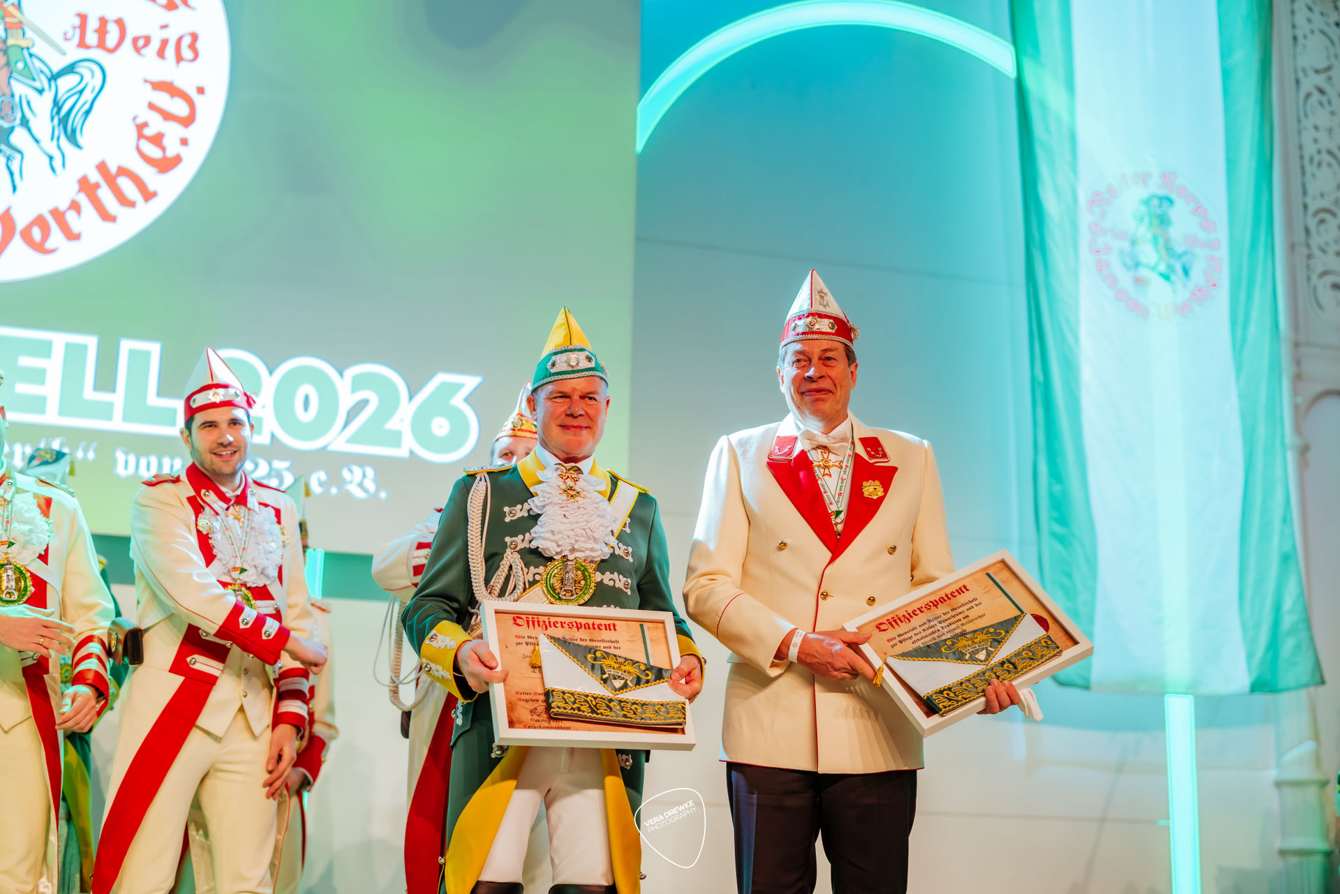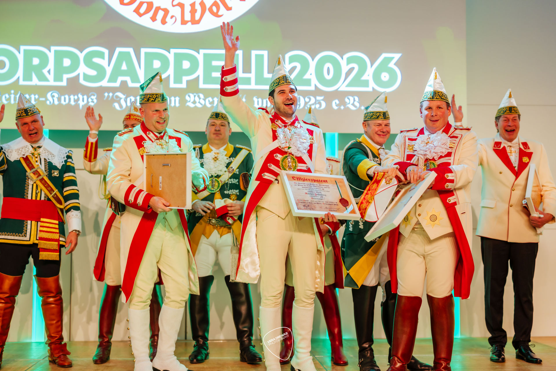 Und weil es da noch „drei Fehlfarben“ gibt, werden die drei zum Ehrenleutnant ernannt und erhalten die „richtige“ Mütze – sehr zur Freude des designierten Prinzen Niklas Jüngling, der einst Tanzoffizier beim Reiter-Korps war. Mit ihnen geehrt werden Hoffriseur Mike Engels und Bauer-Adjutant Dr. Marco Hollekamp und es kann weitergehen im Programm: