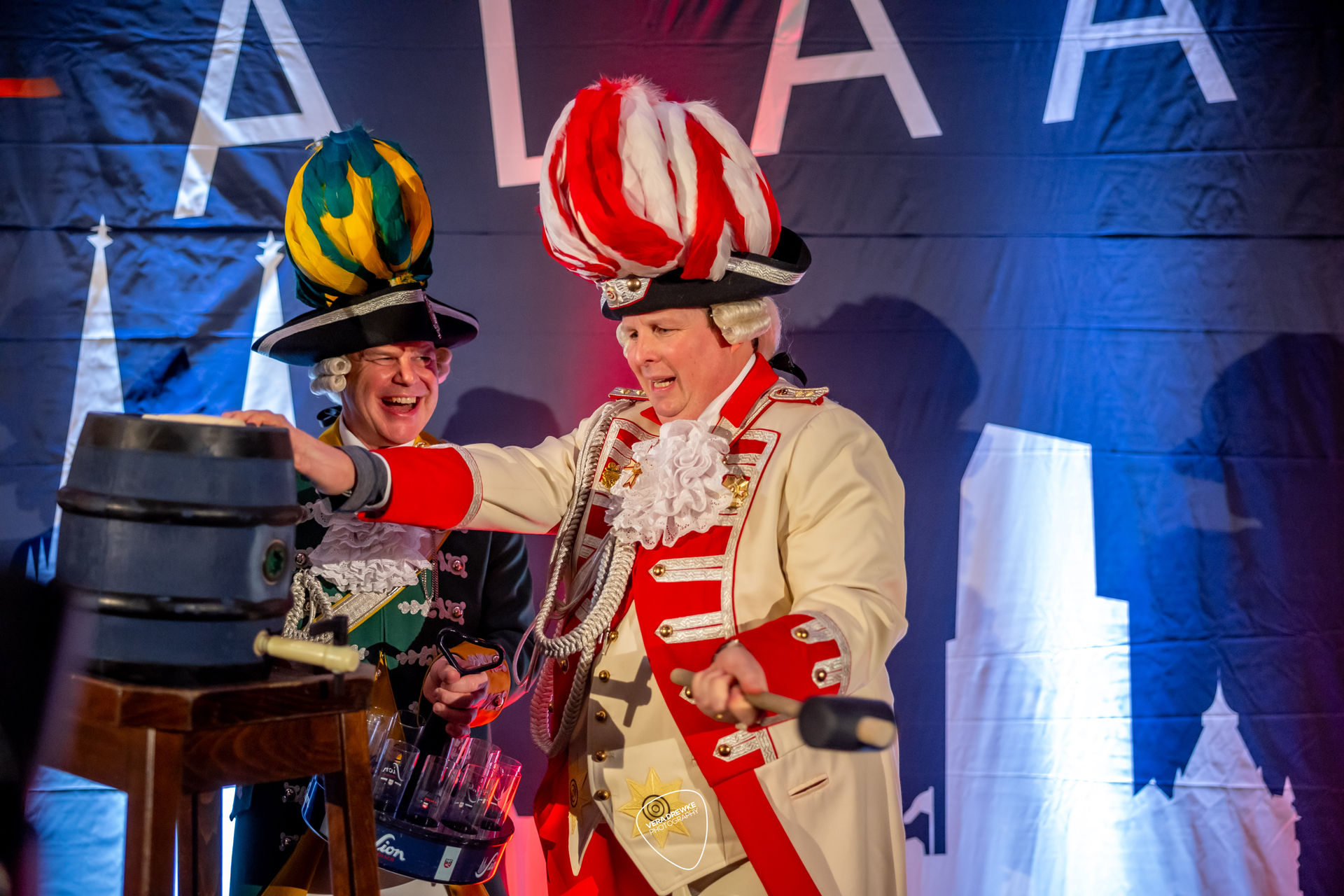 Anschließend übergab Holger Hess dem Dreigestirn symbolisch den Schlüssel zum Hotel, in dem sie nun das Regiment über die Kölner Narren führen werden. Allerdings ließ er sie nicht ohne eine Aufgabe von der Bühne. Jeder von ihnen musste beim Fassanschlagen sein Können unter Beweis stellen. Jungfrau Aenne meisterte dies spielend und konnte den Gästen schnell die ersten Kölsch servieren. Dagegen hatten Prinz und Bauer mehr Mühe damit und man griff auf die bewährten Fähigkeiten der Profis zurück, um gemeinsam auf eine schöne Session anzustoßen.