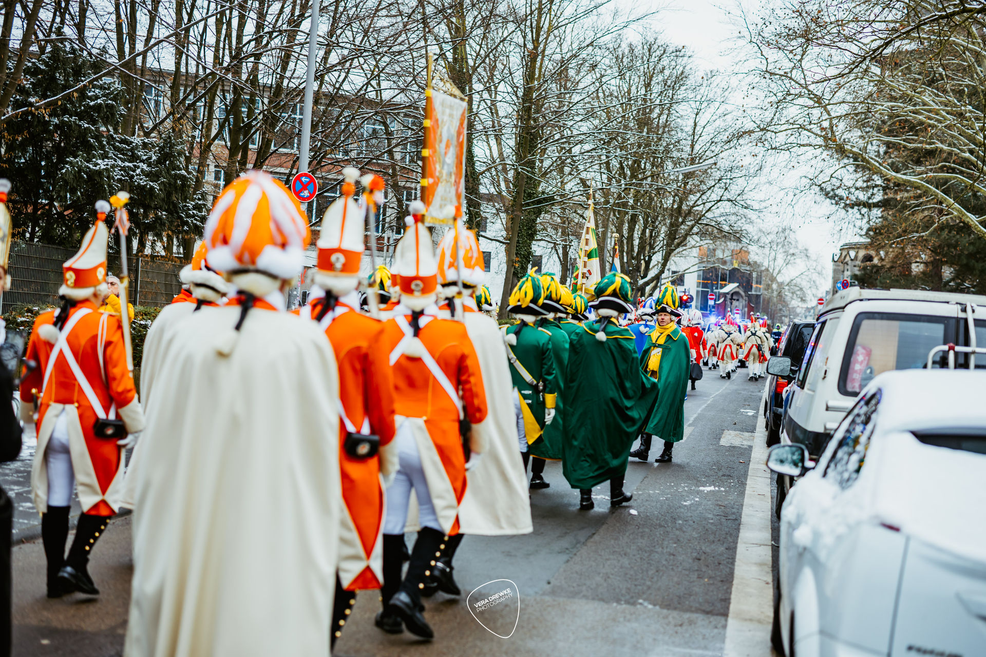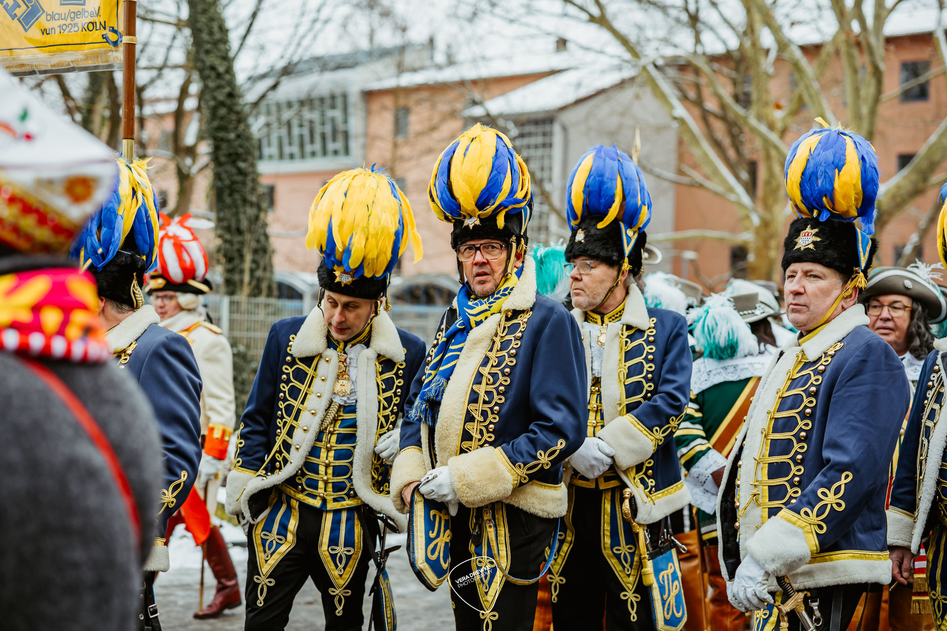 Ausgangspunkt des Zuges war der Prinzen-Garde-Turm, wo sich die Abordnungen der Vereine trafen. Vor dem Start gab es ein großes Hallo. Nach der Advents- und Weihnachtszeit war man froh, sich wieder zu sehen, und es kam eine Stimmung auf wie auf dem Schulhof nach den großen Ferien. Überall war ein fröhliches „gutes Neues Jahr“ zu hören. Alle waren glücklich, denn „et geiht widder loss!“