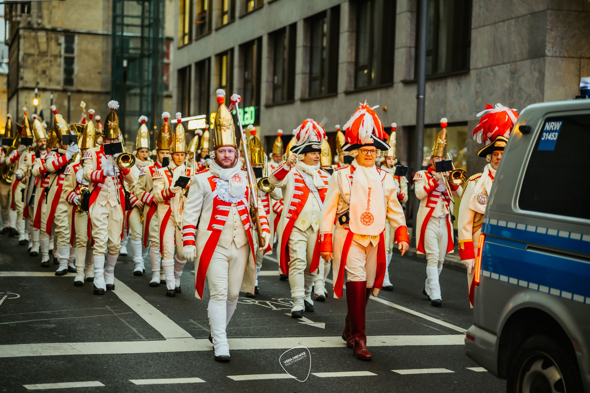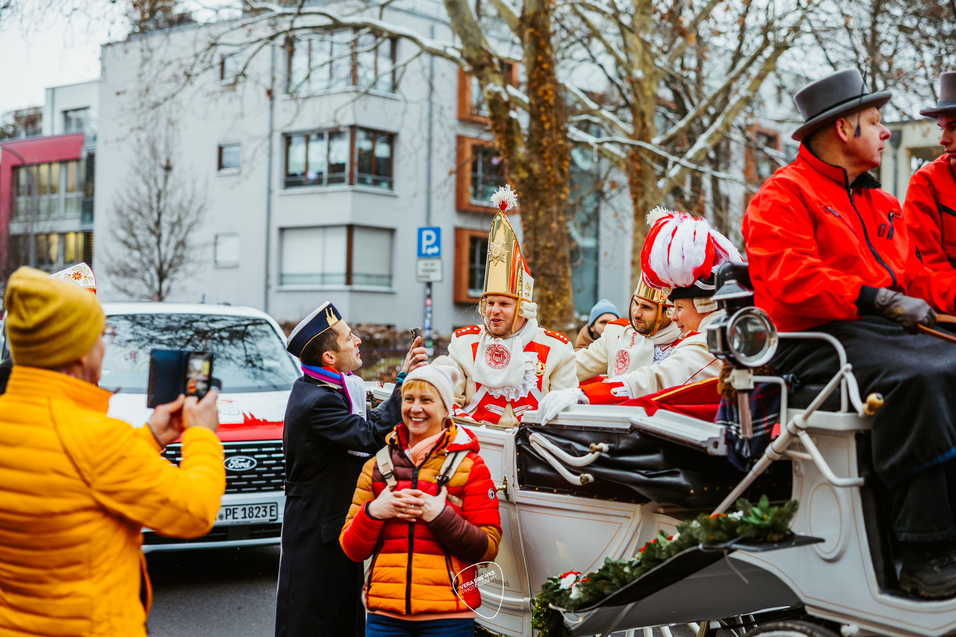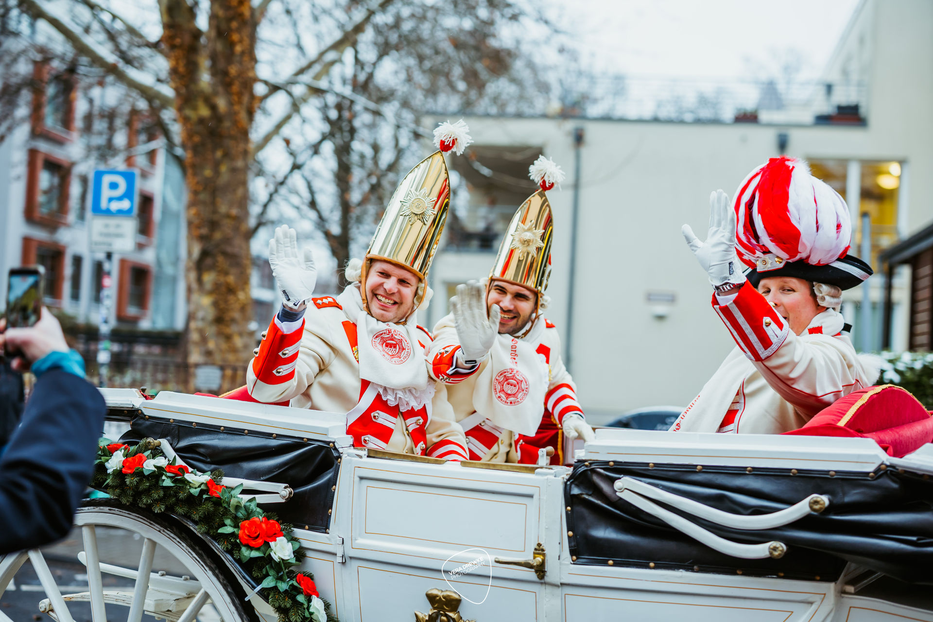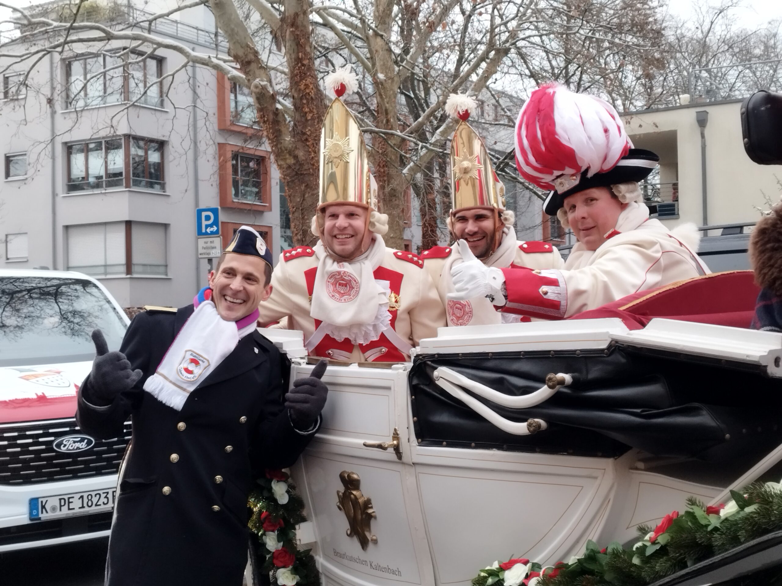 Damit das Trifolium standesgemäß durch die Straßen Kölns kutschiert wurde, stand eine weiße Kutsche mit zwei Schimmeln bereit. Passend zu den Farben des Traditionskorpsist eine Ehrenbezeichnung. Zum Traditionskorps wird eine Gesellschaft vom Festkomitee-Praesidenten ernannt, weil sie sich mit ihrer Brauchtumsförderung in den historischen Uniformen um den Karneval verdient gemacht hat. Derzeit gibt es im Kölner Karneval neun Traditionskorps: die Roten und die Blauen Funken, die Ehrengarde, die Nippeser Bürgerwehr, die Bürgergarde blau-gold, die Prinzengarde, die Altstädter, der Treue Husar und das Reiterkorps Jan von Werth. More waren die Tiere mit roten Decken und roten Fliegenhauben gegen die Kälte geschützt.