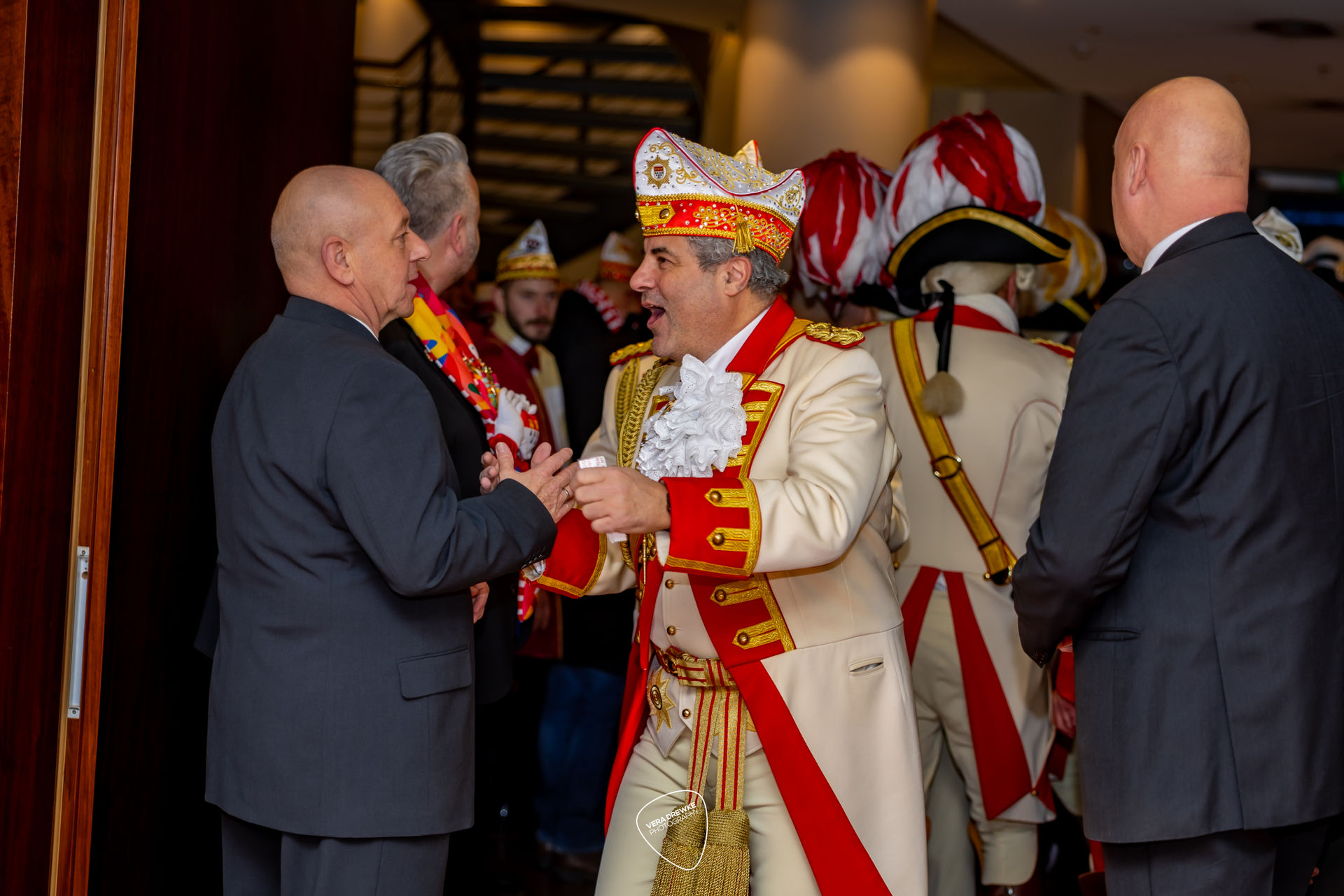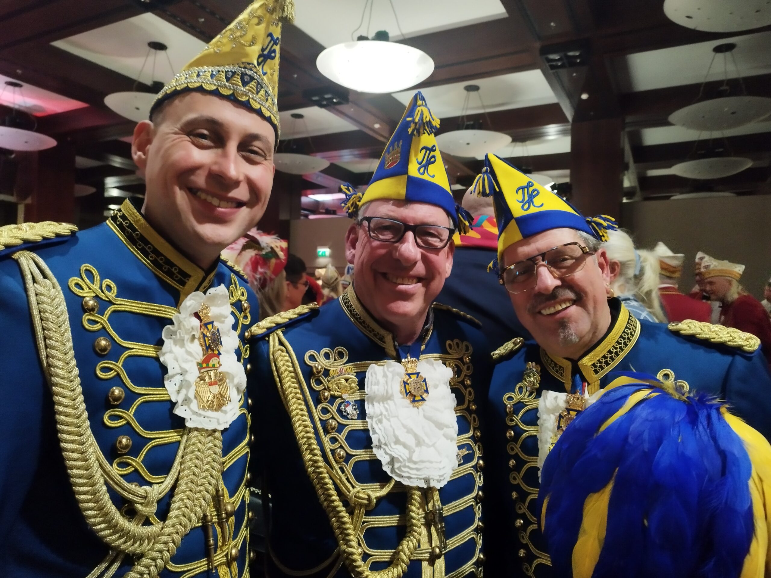 Zum Abschluss des Tages war Zeit für persönliche Gespräche und Gratulationen. Zu den Gratulanten gehörten auch die Dreigestirne der beiden vergangenen Sessionen. Von der KG Treuer Husar Blau-Gelb von 1925 e. V. Köln waren Sascha (Prinz Sascha I.), Werner (Bauer) und Friedrich (Jungfrau Frieda) Klupsch gekommen. Auch René Klöver (Prinz René I.), Michael (Bauer Michael) und Hendrik Ermen (Jungfrau Marlis) von der StattGarde Colonia Ahoj e. V. ließen es sich nicht nehmen, ihren Nachfolgern zu gratulieren.