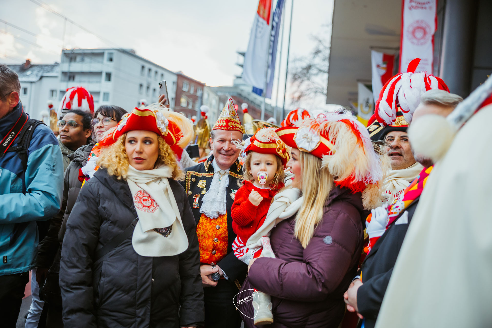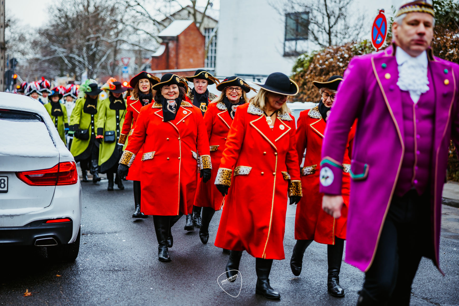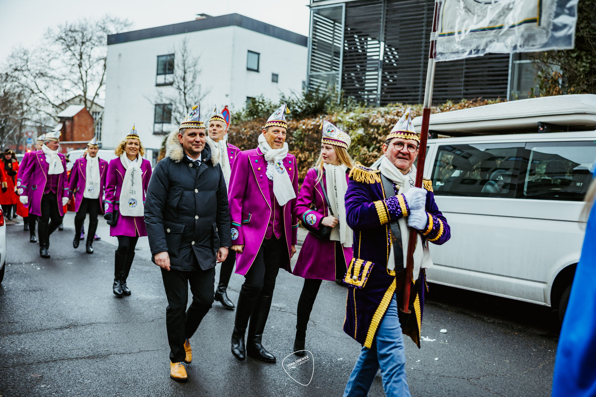 Mit dabei waren natürlich die Partnerinnen des Trifoliums wie auch die Equipe des Dreigestirns: Prinzenführer Marcus Heller und die beiden Adjutanten des Bauern und der Jungfrau Dr. Marco Hollekamp und Dirk Schmitz. Den Schluss des Zuges bildete vor der Kutsche des Dreigestirns natürlich die Prinzen-Garde mit einem großen Musikkorps und Abordnungen ihrer einzelnen Gruppierungen, allen voran der Kindergruppe. Bei der großen Anzahl an Gardisten hatte man den Eindruck, die Prinzen-Garde würde in kompletter Besetzung mitmarschieren.