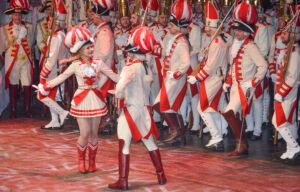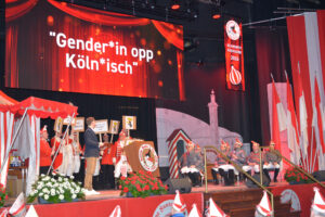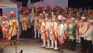 Ob er sich auch wie sein Vorgänger, Rote Funkensind Kölns ältestes Traditionskorps und verstehen sich mit ihren weißen Hosen, roten Uniformröcken und schwarzen Grenadiermützen als Nachfolger der Stadtsoldaten der freien Reichsstadt Köln. Dass sie in friedfertiger Absicht kommen, zeigen die rot-weißen Blumen im Lauf der Knabüß! Bis heute ist die Persiflage der Karnevalssoldaten beliebt, militärische Paraden als Stippeföttchetanz aufzuführen: Dabei stehen jeweils zwei Gardisten Rücken an Rücken, strecken (kölsch: stippe) ihr Gesäß (kölsch: Föttche) heraus und reiben es im Takt der Musik gegeneinander. Um die Kameradschaft im großen Funken-Korps besser pflegen z... More Ehrenpräsident Heinz-Günter Hunold, zu einer „Rampensau“ entwickelt, bleibt noch abzuwarten. Aber Für Spass und Freude auf der Bühne sorgten wie gewohnt die vier Kubbel und die Rekruten, die jeweils kleine, lustige (oder zumindest lustig gemeinte) Sketche aufführten. Sei es die „Kommunikation per Whats App“, die Frage ob der Fahneneid auch gegendert werden müsse oder welche Uniform am besten zu einem Roten Funk passt. Alle Themen wurden mit viel Herzblut auf die Bühne gebracht und das Korps hat sich mit viel Beifall bedankt.