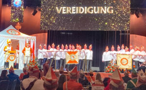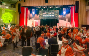 Dienstag Abend im Maritim volles Haus. Die Appelsinefunken feiern mit 650 Gästen den Start in die Session. Die Veranstaltung beginnt, wie in den letzten Jahren schon, mit einem kurzen Film: Rückblick auf die vergangene Session in der Hoffnung, im Saal karnevalsgerechte Stimmung zu erzeugen. Nun ja, mancher mag Gefallen daran gefunden haben. Dann geht’s aber doch richtig los, Präsident Michael Gerhold begrüßt sein Korps und die Ehrengäste, danach führt er routiniert locker durch den Abend. Ernennung der Ehrenoffiziere, Ehrung verdienter Mitglieder und Jubilare, Beförderungen; einer der Höhepunkte, die Vereidigung der Rekruten. Ein anderer war, als Senatspräsident Alexander Gewehr den vorläufigen Beitrag des Senats zum Erwerb der Gesellschaftsimmobilie überreichte. Michael Gerhold nahm den Scheck über 175.000 € gern in Empfang.