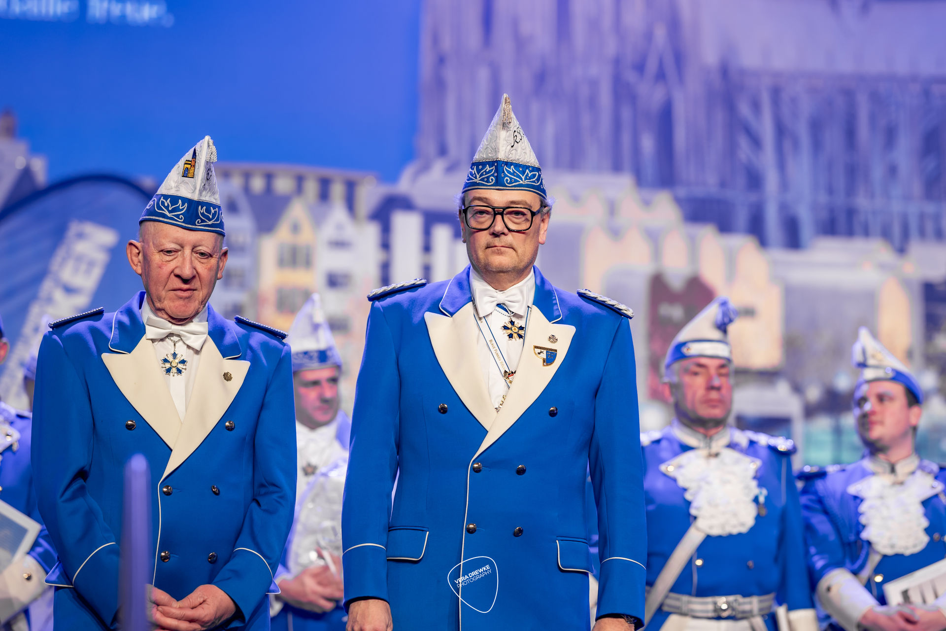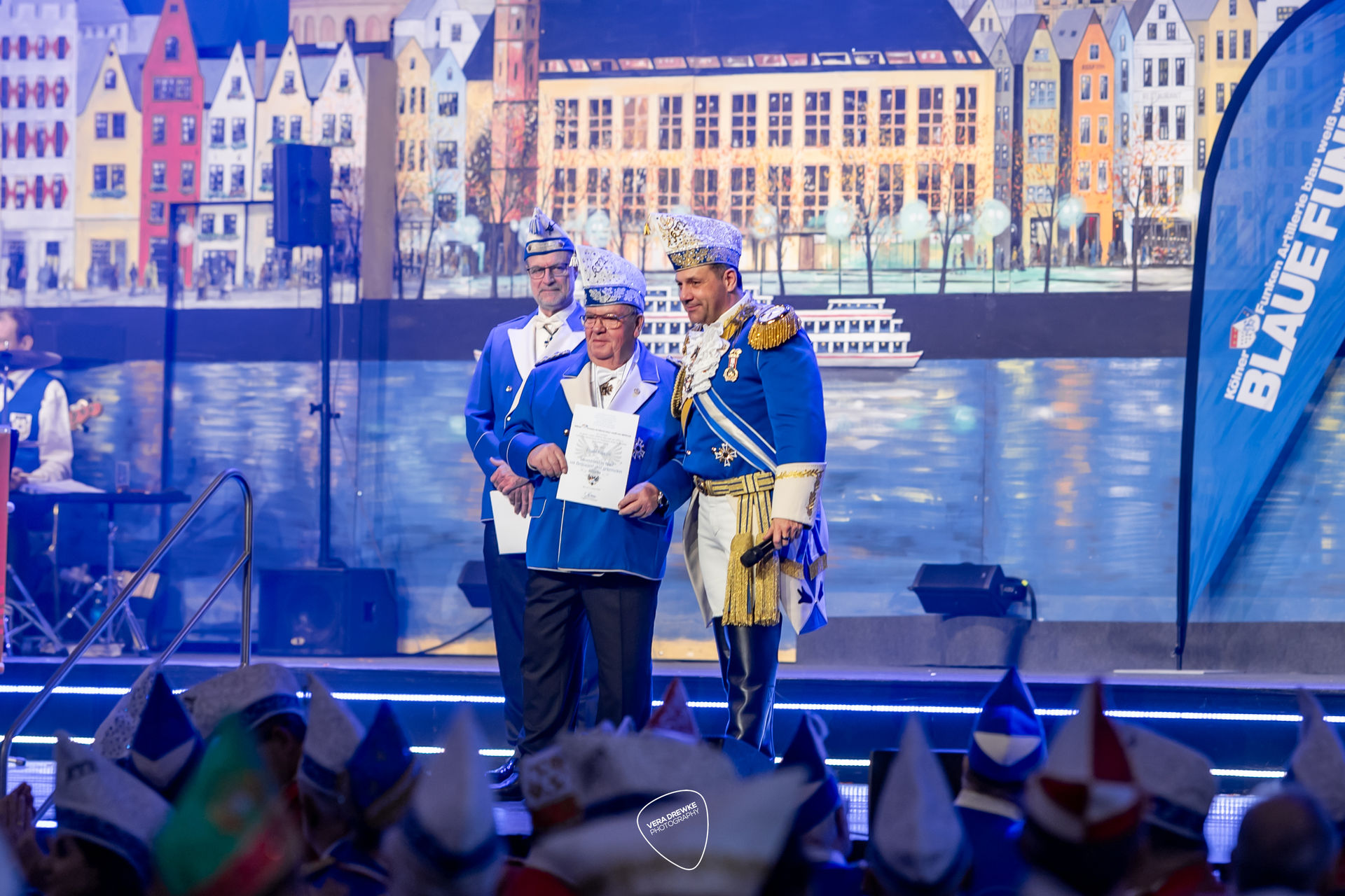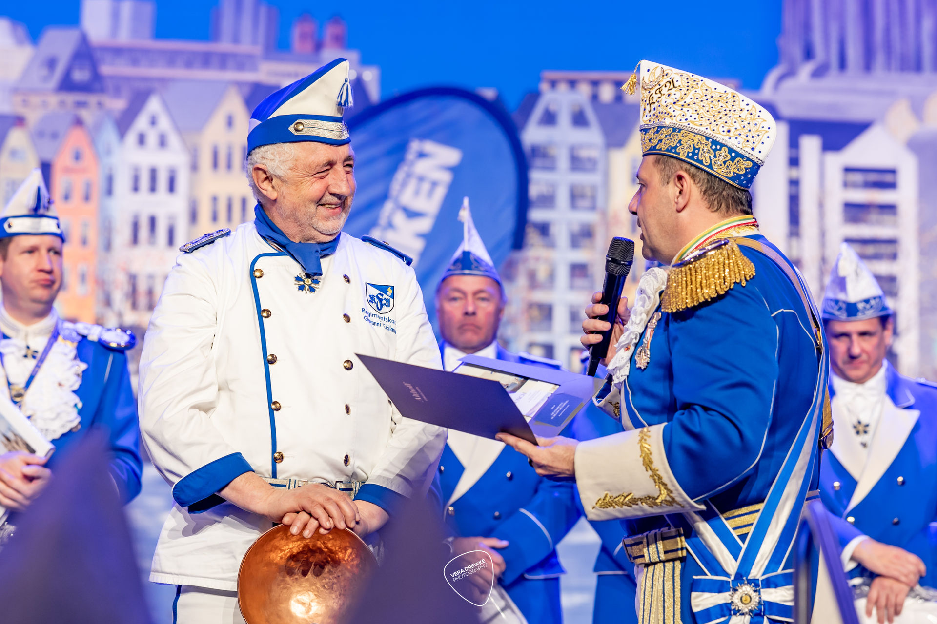 Ewald Kappes wird für seine 50-jährige Mitgliedschaft bei den Blauen Funken geehrt. „Er ist so lange beim Traditionskorps“, scherzte Björn Griesemann, „dass er noch im Leichenwagen der Familie Kuckelkorn zu Auftritten gefahren ist!“. Kappes erhält die höchste Auszeichnung, die die Blauen Funken zu vergeben haben, den Treueorden in Gold mit Brilianten und gekreuzten Säbeln.