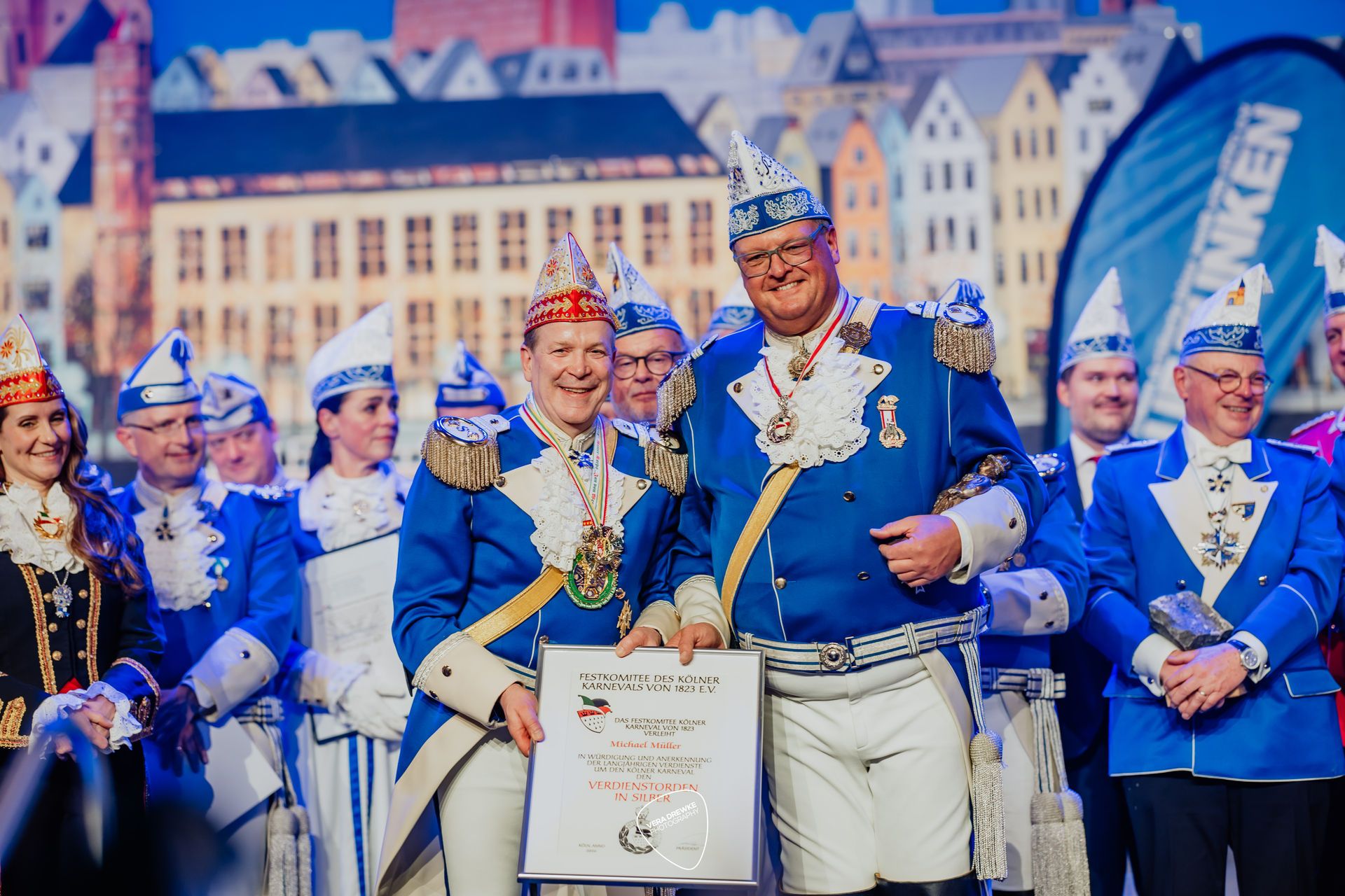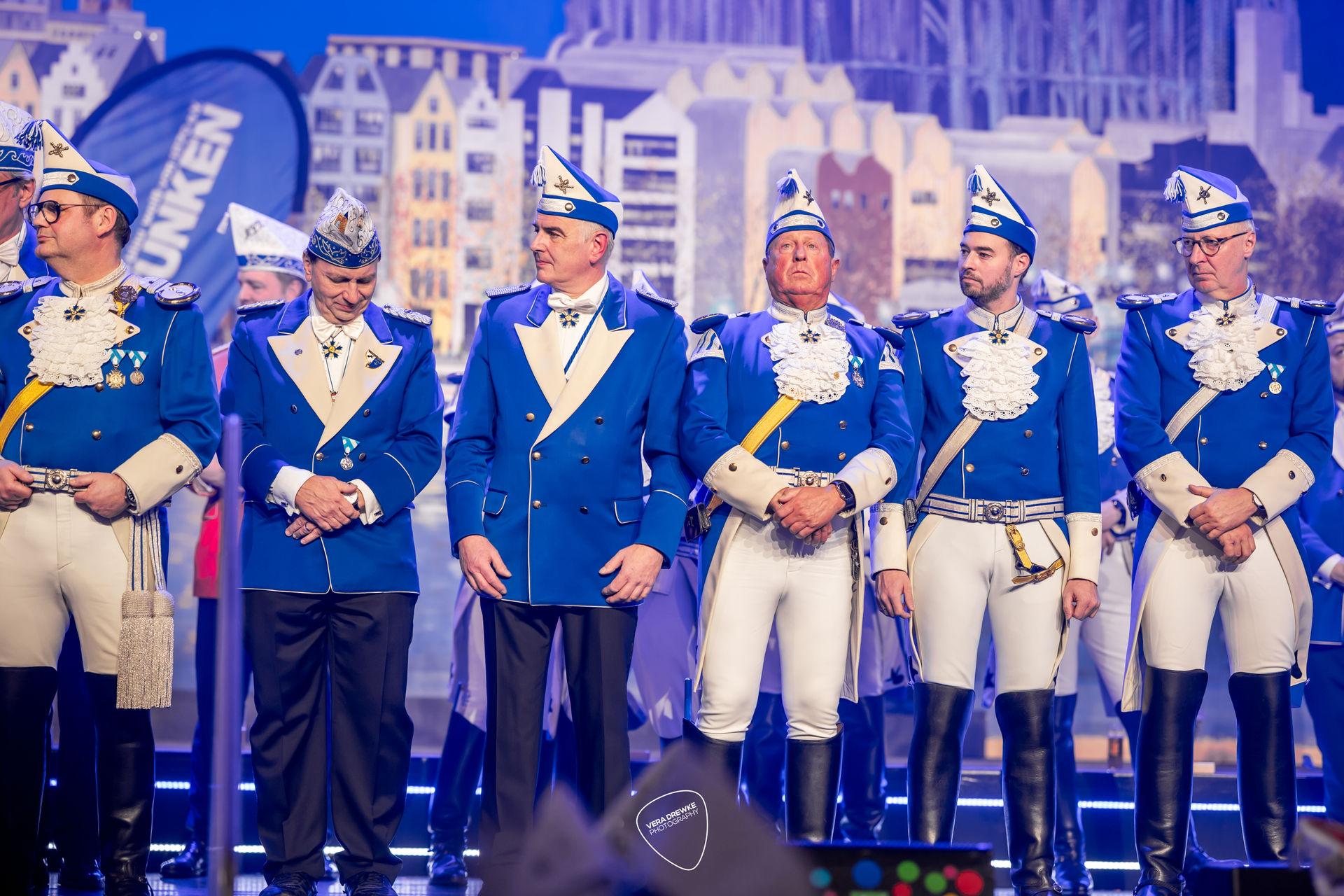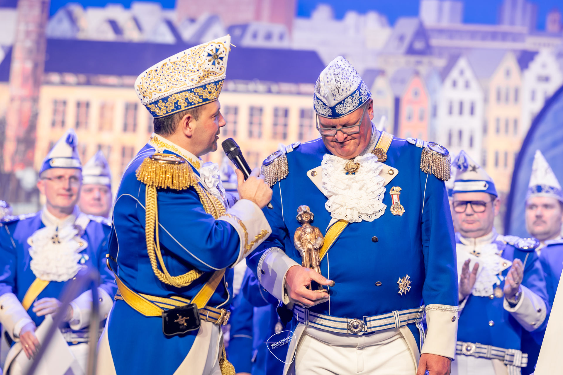Ewald Kappes wird für seine 50-jährige Mitgliedschaft bei den Blauen Funken geehrt. „Er ist so lange beim Traditionskorps“, scherzte Björn Griesemann, „dass er noch im Leichenwagen der Familie Kuckelkorn zu Auftritten gefahren ist!“. Kappes erhält die höchste Auszeichnung, die die Blauen Funken zu vergeben haben, den Treueorden in Gold mit Brilianten und gekreuzten Säbeln.
