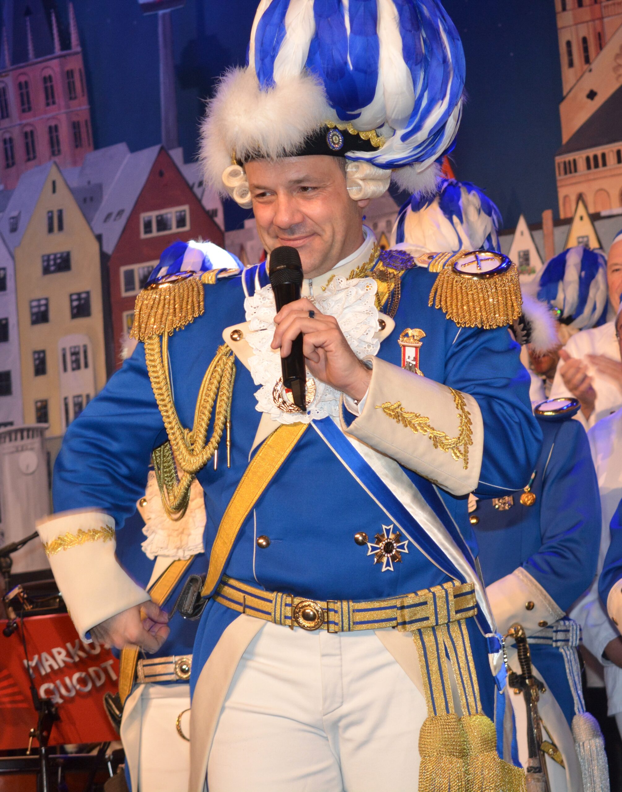 In seiner Rede unterstrich der Präsident der Blauen Funken die Bedeutung des Ehrenamts für das Traditionskorps  und machte dies am Beispiel zahlreicher Blauen Funken deutlich. Seien es die 20.000 Gäste, die jedes Jahr auf den Veranstaltungen von Kameraden betreut werden, das Engagement der jungen Blauen Funken für die BlueWhite-Party oder die neue Kindersitzung im Sachsenturm, die von der Kinder- und Jugend­tanz­gruppe auf die Beine gestellt wurde. Karneval ist für ihn die Speerspitze der Kultur und gelebte Integration. Der Karneval macheKöln zu dem, was es ist: das liebevollste Stück Ääd, das wir haben.