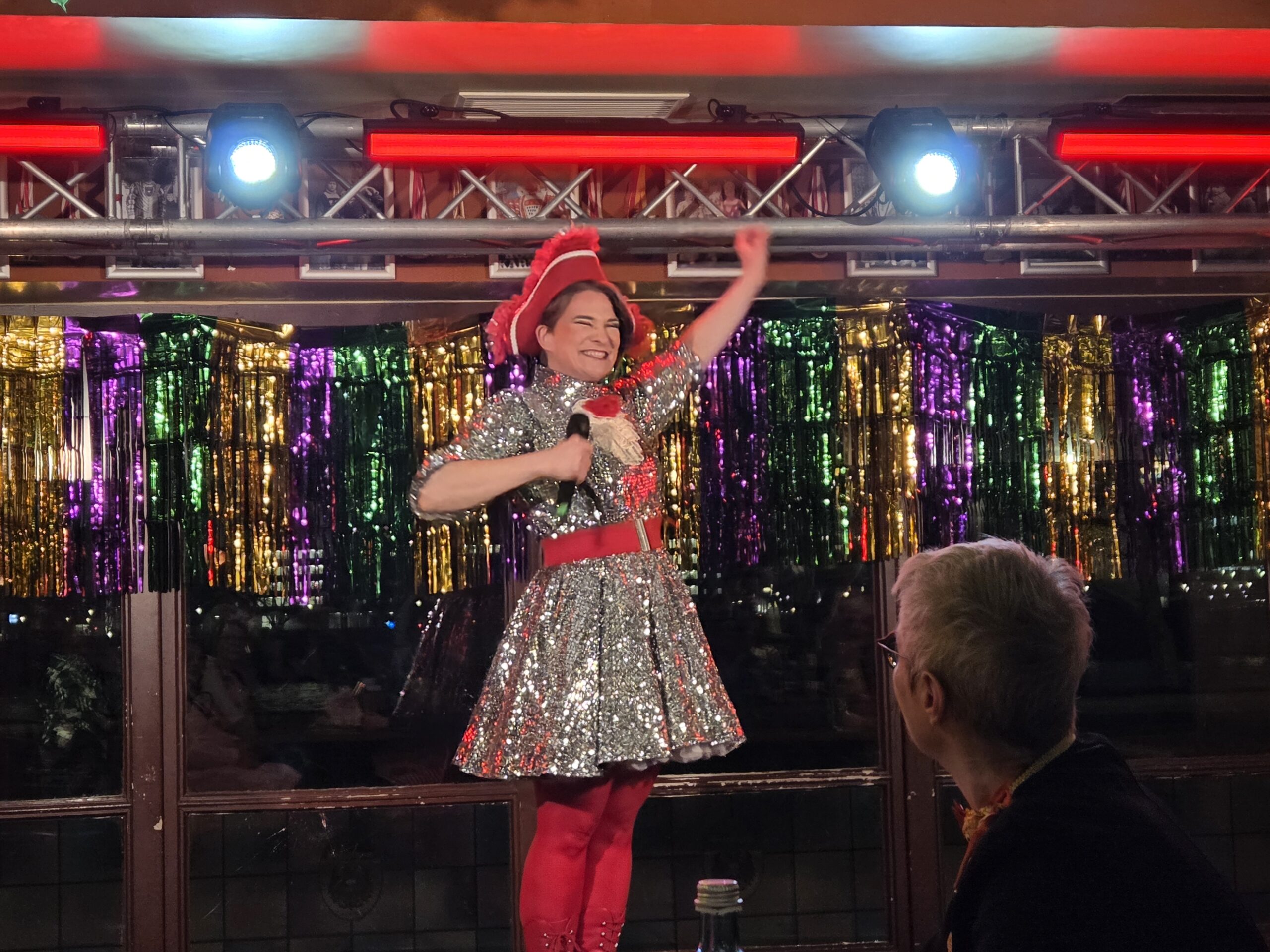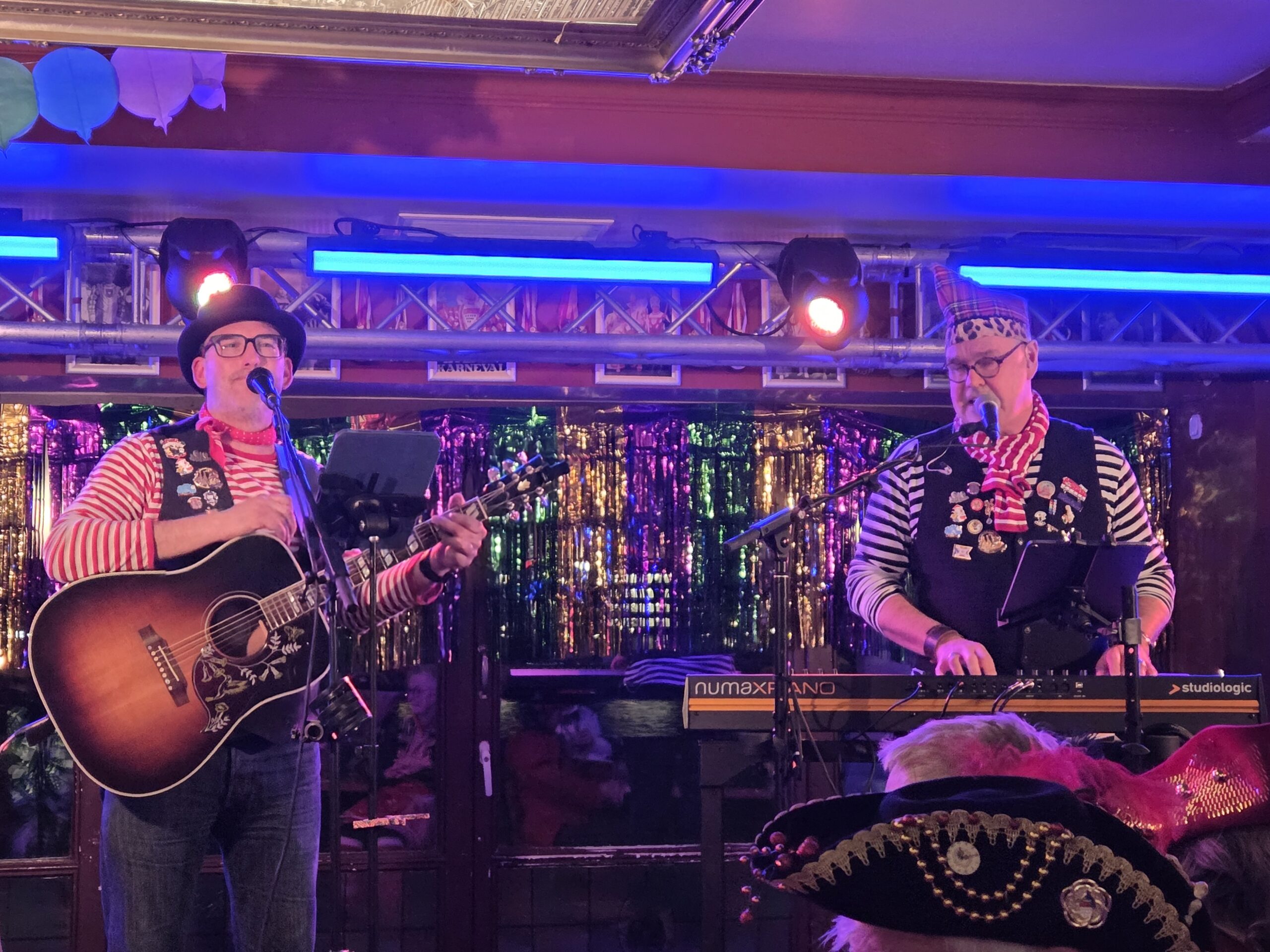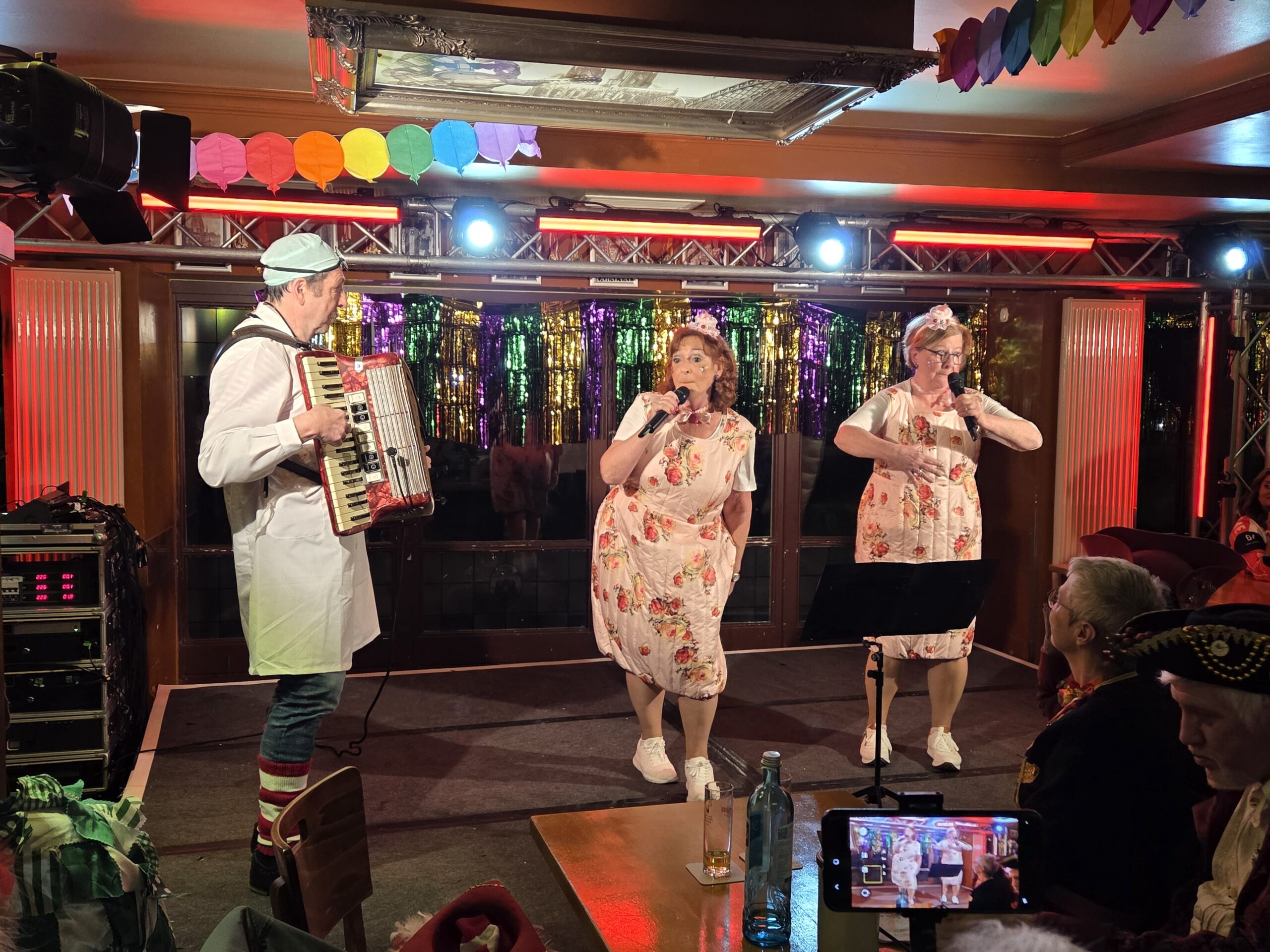 Musikalisch ging es auch mit dem Thekenterzett weiter. Die drei Nippeser – Steffi Everding, Heiner Everding und Winston Friday – sangen und spielten Quetsch und Kontrabass. Sie präsentierten eine bunte Mischung aus kölschen Klassikern und modernen Hits der letzten hundert Jahre. Bekannte und weniger bekannte Lieder von Willi Ostermann, Jupp Schmitz und weiteren kölschen Komponisten und Textern gaben sie zum Besten und die ganze Kneipe sang mit.
