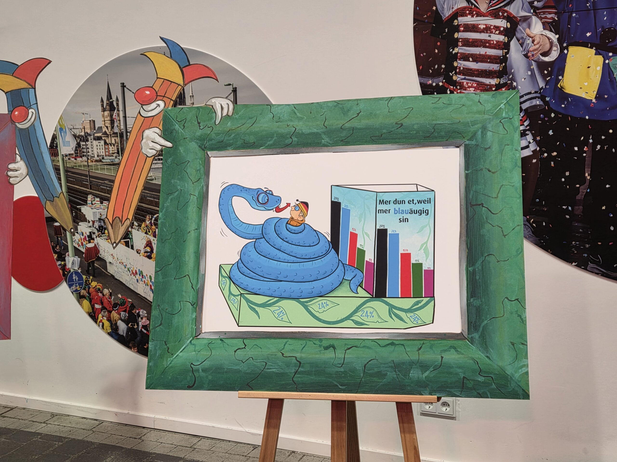 Der Wagen „Mer dun et weil mer blauäugig sin“ greift die aktuellen Wahlprognosen und -ergebnisse auf. Die Schlange Kaa, dargestellt in „AfD-Blau“ und mit dem roten Pfeil des Parteisignets versehen, hat den Deutschen Michel so fest umschlungen und hypnotisiert, dass er nicht erkennt, wie er durch sein Wahlverhalten die Errungenschaften der freiheitlichen Demokratie gefährdet. Marc Michelske betrachtet es als ein wichtiges Signal für die Demokratie, wenn diese Partei wieder unter zehn Prozent fallen würde.