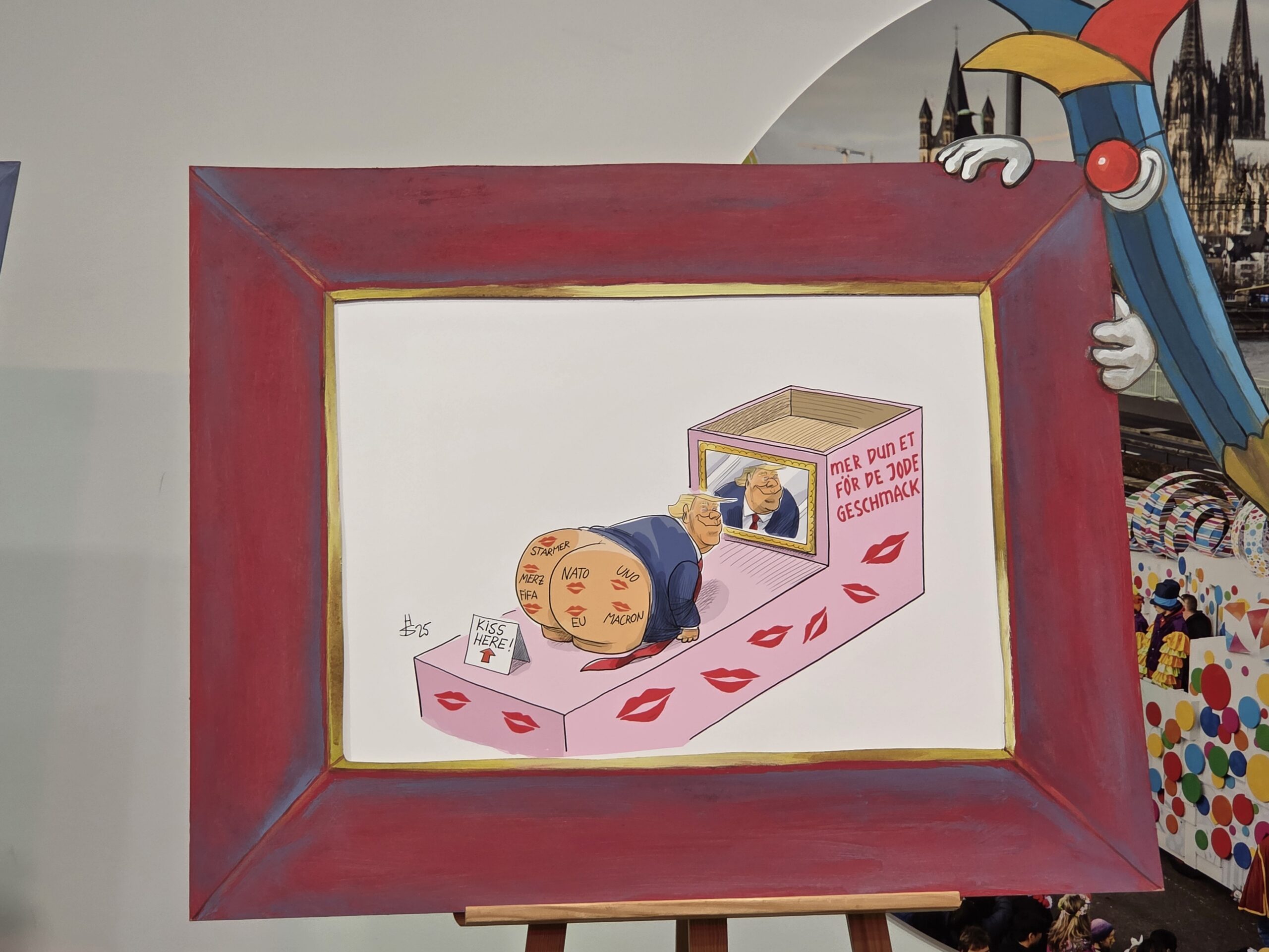 Im internationalen Teil wird das Verhalten der EU auf der politischen Bühne kritisiert. So etwa in den Wagen „Mer dun et ohne EUch“ oder „MER DUN ET FÖR DE JODE GESCHMACK“. In letzterem erfreut sich der derzeitige US-Präsident an seinem eigenen Spiegelbild und lässt sich genüsslich seinen „bläcken A…“ küssen. Ob EU, NATO, Macron, Merz, Starmer, FIFA oder UNO – alle machen mit.