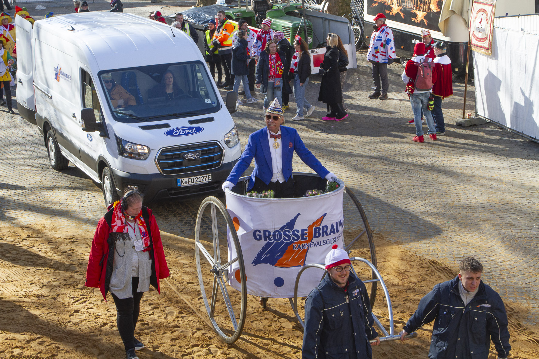 Der Rosenmontagszugist der Höhepunkt der jecken Session, bei dem sich rund eine Million Jecke am Straßenrand drängeln, um gemeinsam das „schönste Ereignis“ im ganzen Jahr – wie die Kölner meinen – zu feiern. Alle Infos unter www.koelnerkarneval.de/karnevalszuege/.rosenmontagszug/ More beginnt für Winters mitten in der Nacht. Um 3:15 Uhr treffen sich die Fahrer und Fahrerinnen, werden per Shuttle zum Maarweg ins Festkomitee gebracht und dort mit einem Frühstück gestärkt. Anschließend geht es in die Ehrenfelder Halle, wo die beladenen Transits bereitstehen. Im Konvoi fahren sie zurück und reihen sich nach einen festgelegten Plan zwischen Fest- und Persiflagewagen ein. Gegen 7 Uhr rollen sie zu den Aufstellplätzen in der Südstadt.