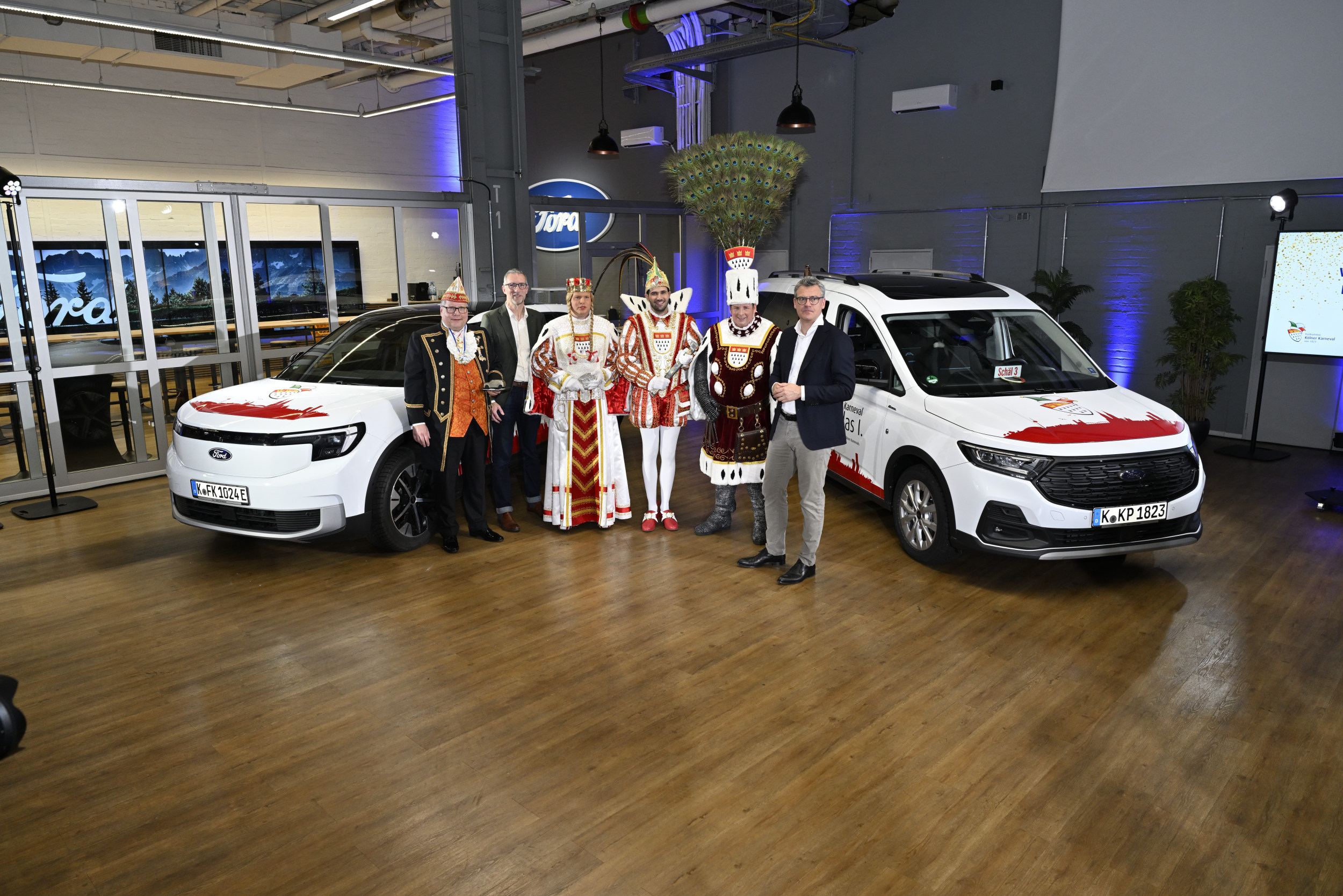 Von links nach rechts: Lutz Schade (Vizepräsident Festkomitee Kölner Karnevalvertritt die Interessen von mehr als hundert Karnevalsgesellschaften und Vereinen. Seine Aufgabenliste reicht von der Organisation des Rosenmontagszuges, der Wahl und Vorbereitung des Dreigestirns, der Durchführung der Proklamation, der Jugend- und Nachwuchsförderung über die Darstellung des Kölner Karnevals in der Presse, die Vermarktung des Sessionslogos, die Übertragungsrechte für Hörfunk- und Fernsehsitzungen, die Vertretung gegenüber Stadt und Öffentlichkeit bis hin zur Dokumentation der eigenen Geschichte im Kölner Karnevalsmuseum. More), Dirk Ellenbeck (Direktor Kommunikation Öffentlichkeitsarbeit, Ford Deutschland, Österreich und Schweiz), Kölner Dreigestirn 2026: Jungfrau Aenne, Prinz Niklas, Bauer Clemens und Christoph Herr (Managing Director, Ford Deutschland, Österreich und Schweiz)