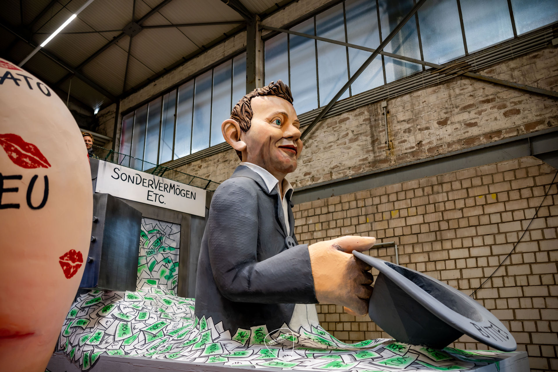 Die Koalition wird ein weiteres Mal in dem Wagen „MER DUNET MIT ÜHREM GELD“ persifliert. Vor dem offenen Tresorraum „SONDERVERMÖGEN ETC.“, aus dem Hundert-Euro-Scheine nur so herausströmen, steht Finanzminister Lars Klingbeil und hält bittend einen Hut auf.