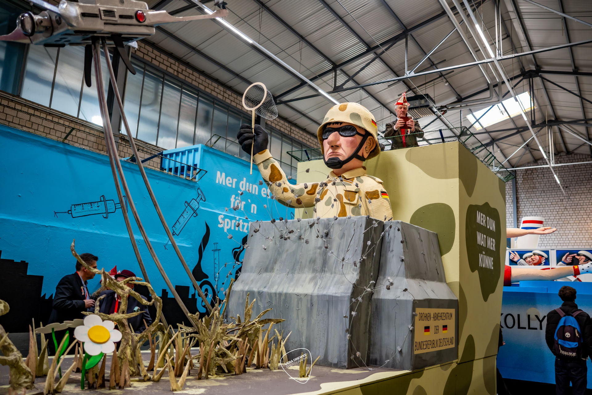 Auch das Thema Krieg spielt in dem Wagen „MER DUN WAT MER KÜNNE“ eine Rolle. Hier wird die Frage gestellt, ob das „DROHNEN-ABWEHRZENTRUM DER BUNDESREPUBLIK DEUTSCHLAND“ richtig ausgerüstet ist, wenn es mit einem Schmetterlingsnetz auf „Drohnenfang“ geht.