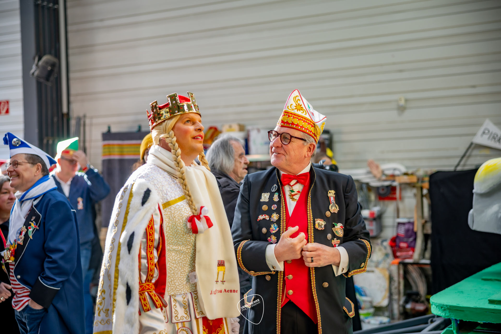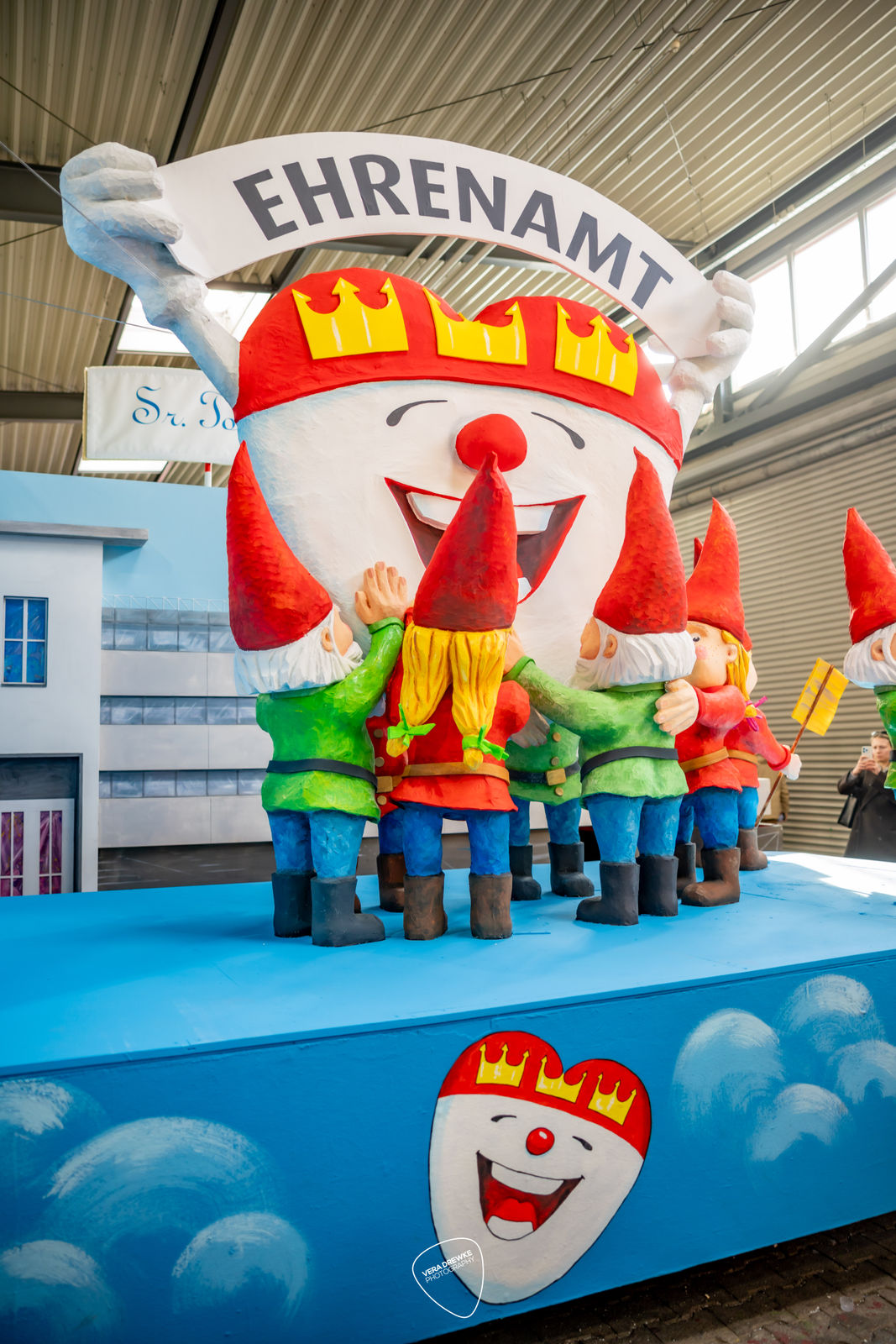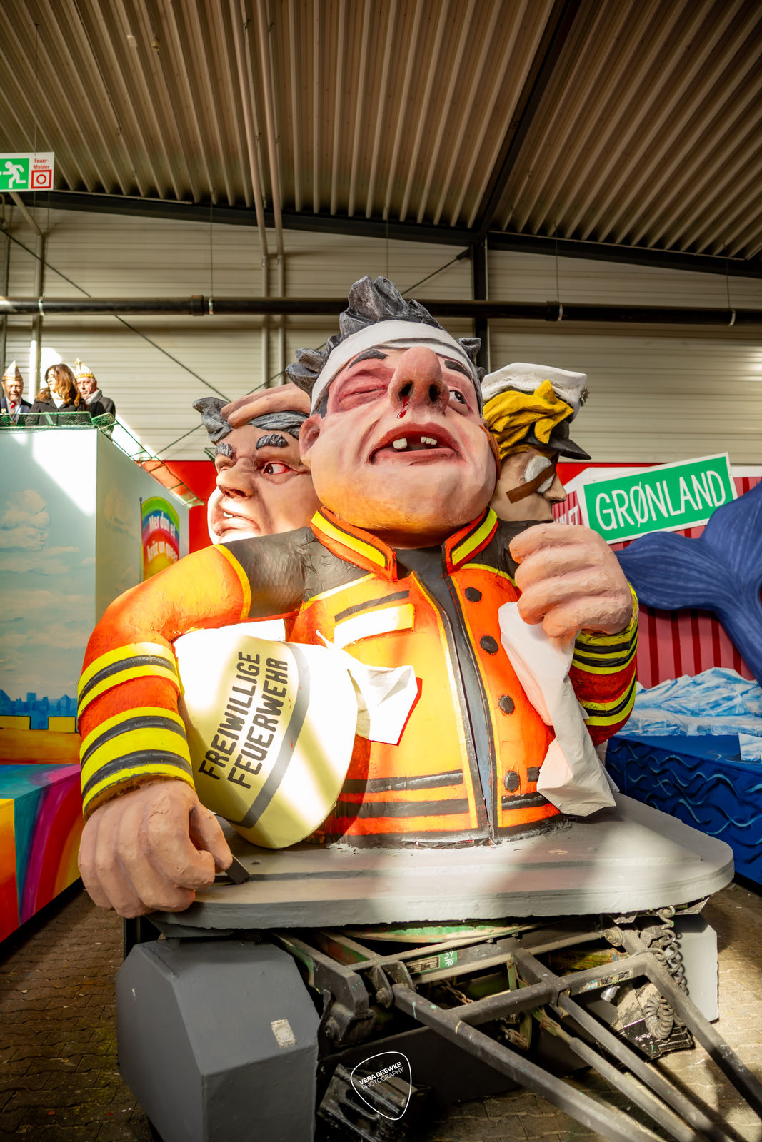 Beendet wurde der Empfang- mit dem Auftritt des großen und des kleinen Dreigestirns, wonach sich alle Anwesenden zur Wagenhalle begaben. Nun folgte der mit großer Spannung erwartete Augenblick, die fertiggestellten Wagen erstmals in natura in Augenschein nehmen zu können.