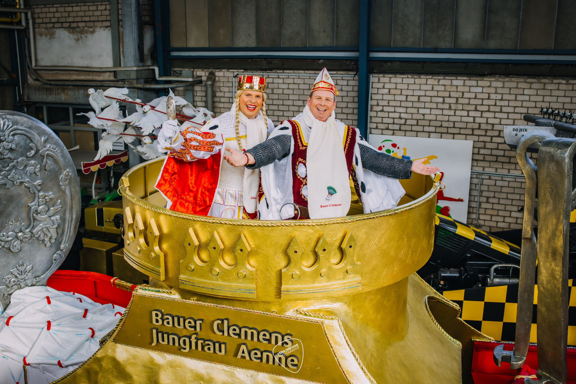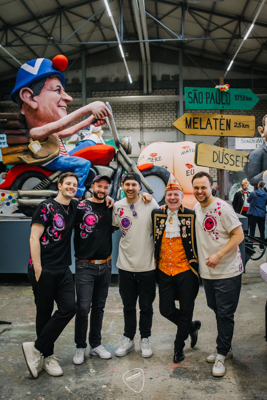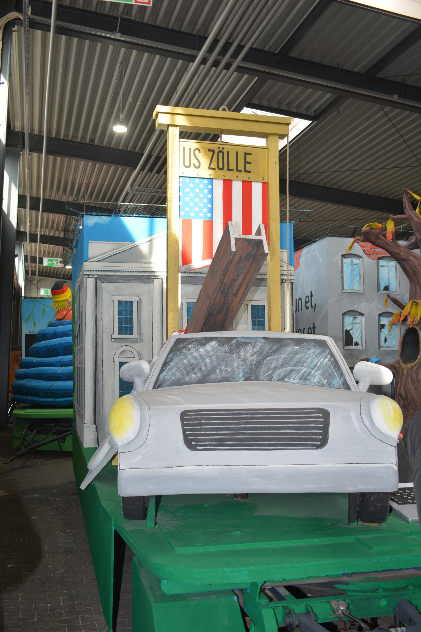 Beendet wurde der Empfang- mit dem Auftritt des großen und des kleinen Dreigestirns, wonach sich alle Anwesenden zur Wagenhalle begaben. Nun folgte der mit großer Spannung erwartete Augenblick, die fertiggestellten Wagen erstmals in natura in Augenschein nehmen zu können.