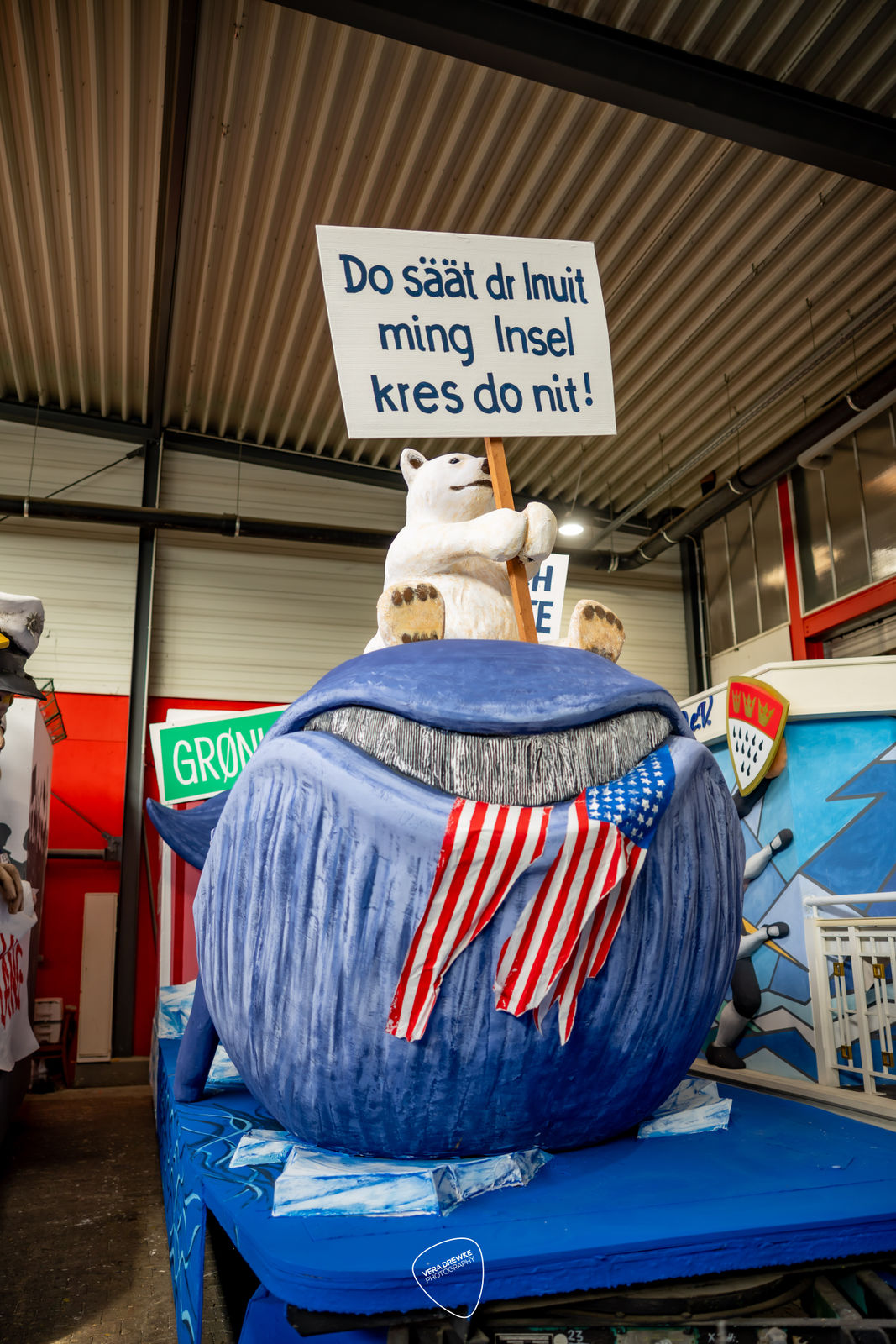 Eine der ersten Ideen für den Zug war das Thema Grönland, welches der gegenwärtige Präsident der Vereinigten Staaten gerne annektieren würde. Es trat für eine gewisse Zeit in den Hintergrund, ist jedoch kürzlich wieder in den Fokus gerückt. Deshalb wurden die Pläne für den Wagen „MER DUN ET FÖR UNS GRÖNLAND“ realisiert. Vor „GRØNLAND“ schwimmt in der kalten See ein Wal, der eine zerrissene amerikanische Flagge im Maul hält. Auf ihm sitzt ein Eisbär, der das Schild „Do säät dr Inuit ming Insel kres do nit!“ hochhält. Das Walross hinter ihm ist „DÄNISCH DYNAMITE“.