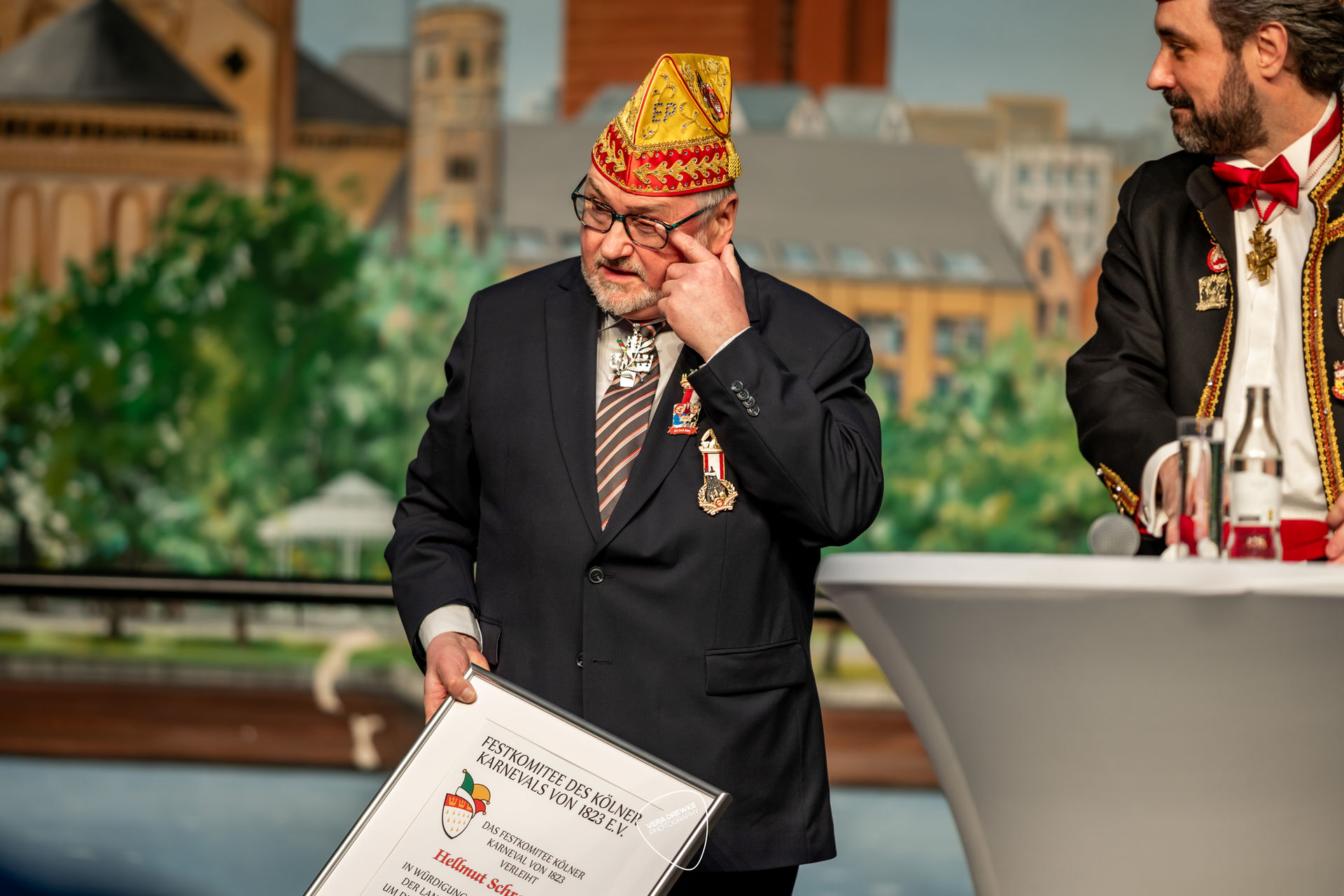 Beim vorausgehenden Empfang wurde Hellmut Schramm, Ehrenpräsident der KG Schlenderhaner Lumpe e. V., für seine langjährige ehrenamtliche Tätigkeit als Leiter der Rosenmontagszugleitstelle mit dem Zuglorbeer in Silber ausgezeichnet.