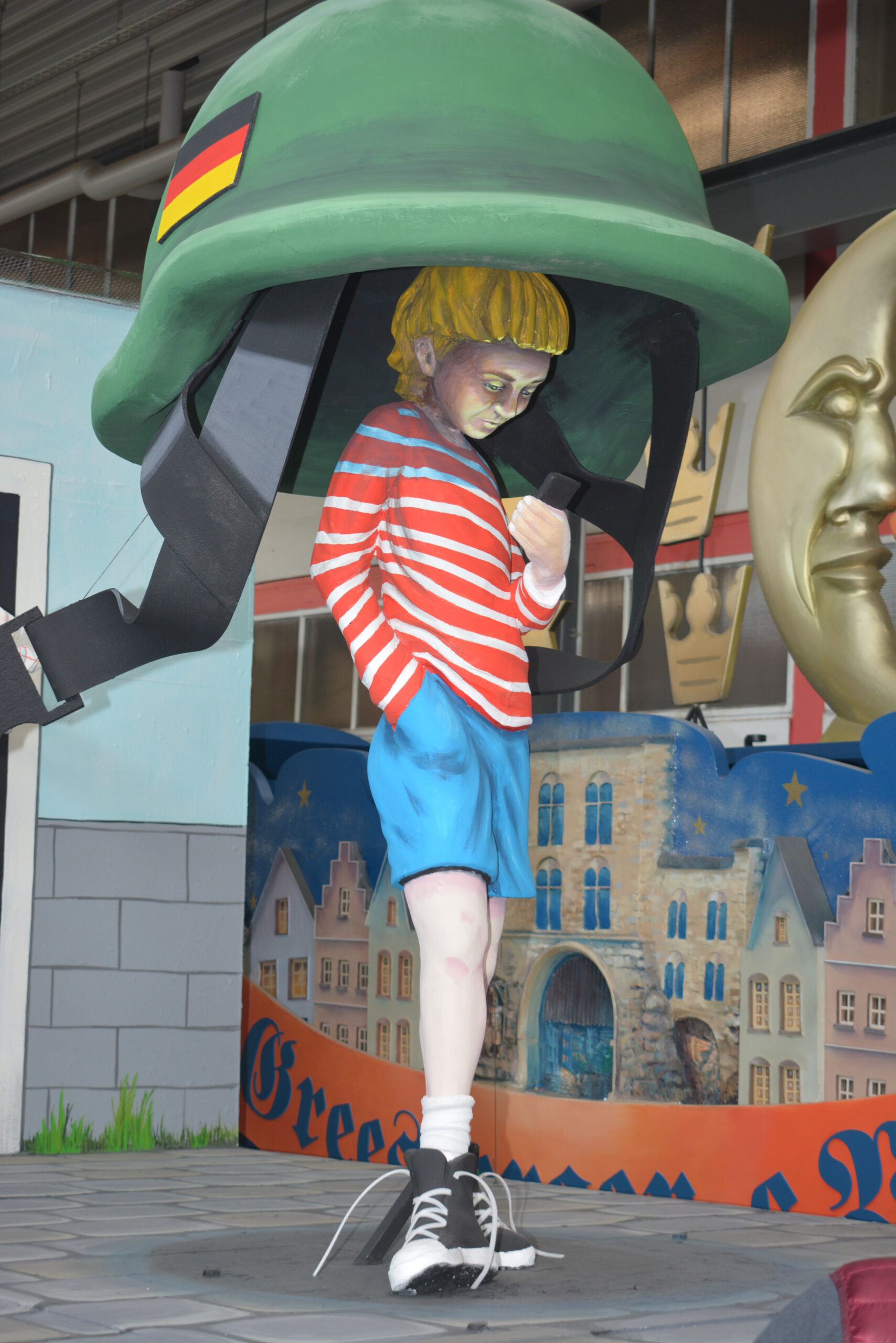 Der Wagen „MER DUN ET – DAS CRAZY“ nimmt sich das neue Wehrpflichtgesetz zum Thema. Ein Junge, die Linke in der Hosentasche, schaut versunken auf das Handy in seiner rechten Hand. Sein Kopf verschwindet unter einem riesigen Bundeswehrhelm. Aus der Haustür ist der Abschied winkende Arm der Mutter zu sehen.