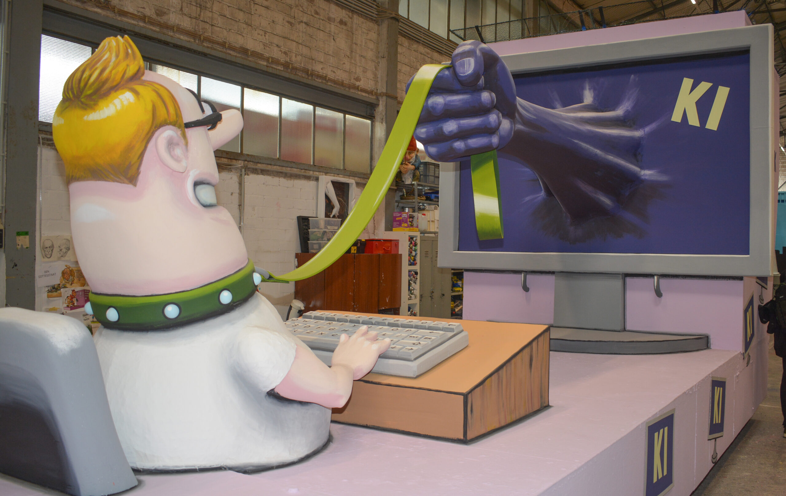 Ein Thema, das für unsere Gesellschaft immer wichtiger wird, ist der Umgang mit Künstlicher Intelligenz. Der Wagen „MER DUN ET US FREIE STÖCK“ zeigt einen Nutzer, der am Computer arbeitet. Aus dem Bildschirm greift gespenstisch eine Hand hervor, die den Wehrlosen wie einen Hund an der Leine führt. Dabei stellt sich die Frage, wer letztlich die Kontrolle behält – der Mensch oder die Maschine?