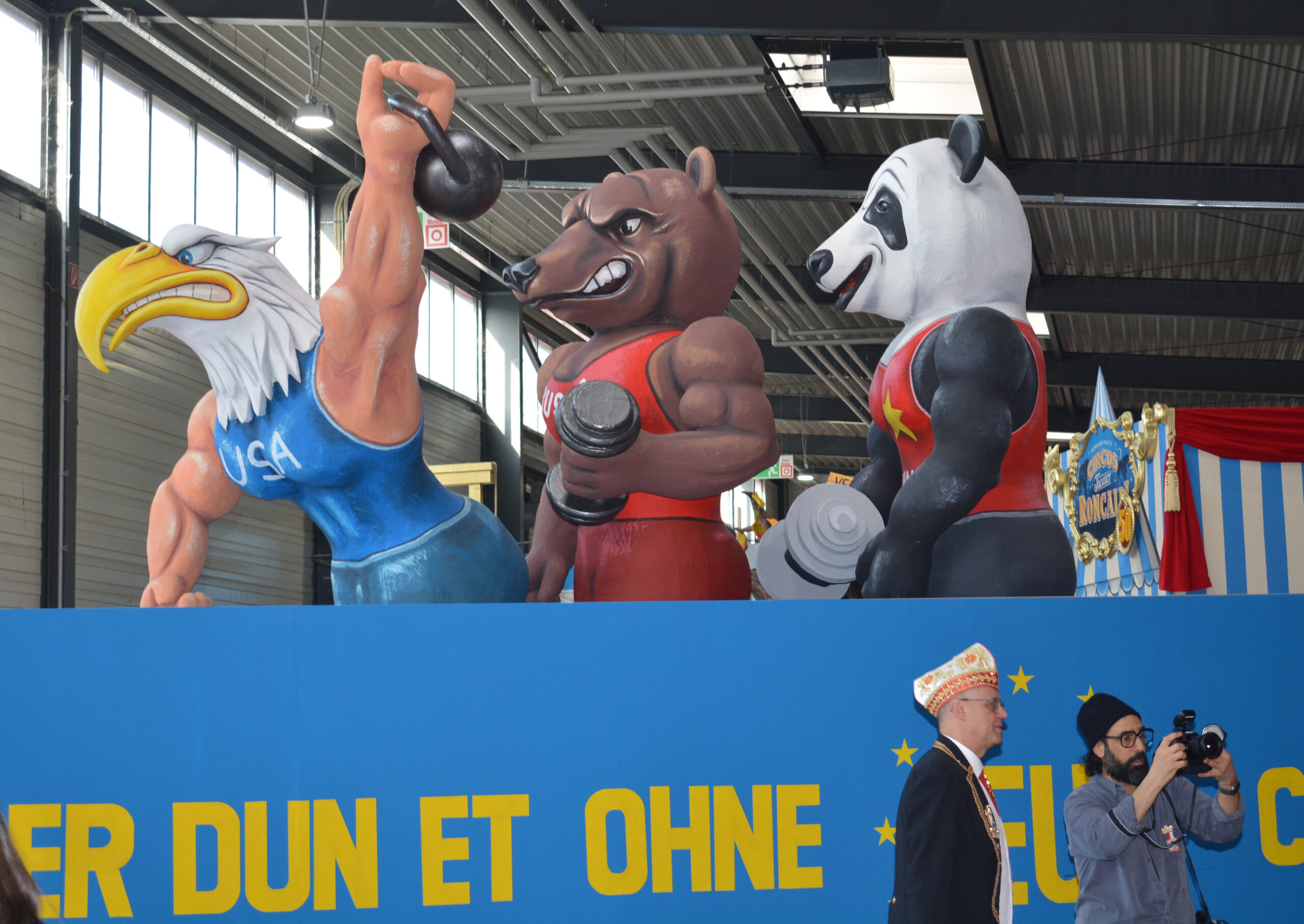 „MER DUN ET OHNE EU CH“ kritisch hinterfragt. Seeadler, Bär und Panda symbolisieren die drei Weltmächte USA, Russland und China und sind als Schwerathleten dargestellt. Mit ihren schweren Gewichten ängstigen sie den (Angst)Hasen EU, der sich beinahe an einem „Leichtgewicht“ verhebt. Die jüngsten Entwicklungen zeigen den Europäern deutlich, dass sie auf der politischen Weltbühne an den Rand gedrängt werden. Eine Situation, für die sie mitverantwortlich sind.