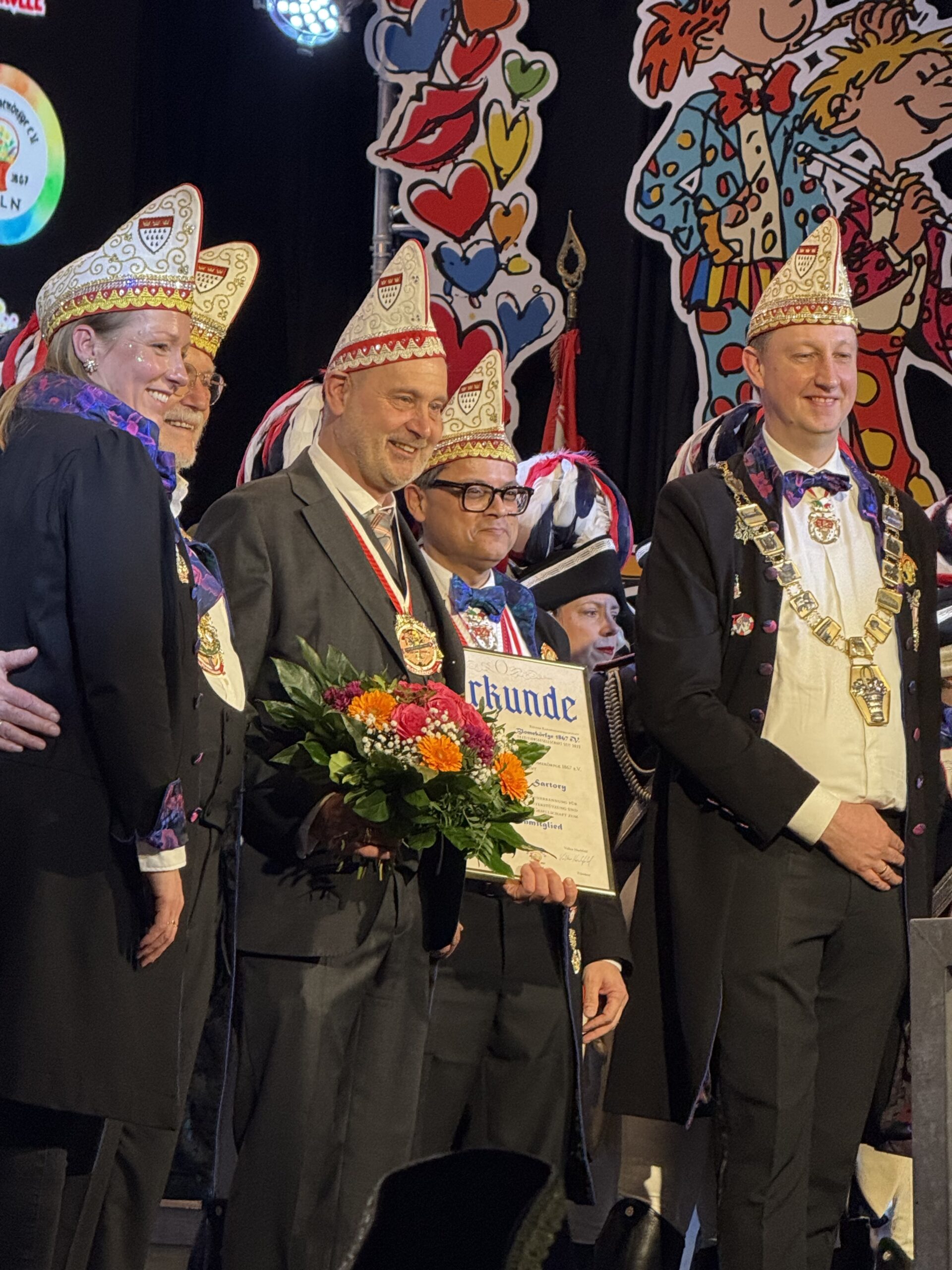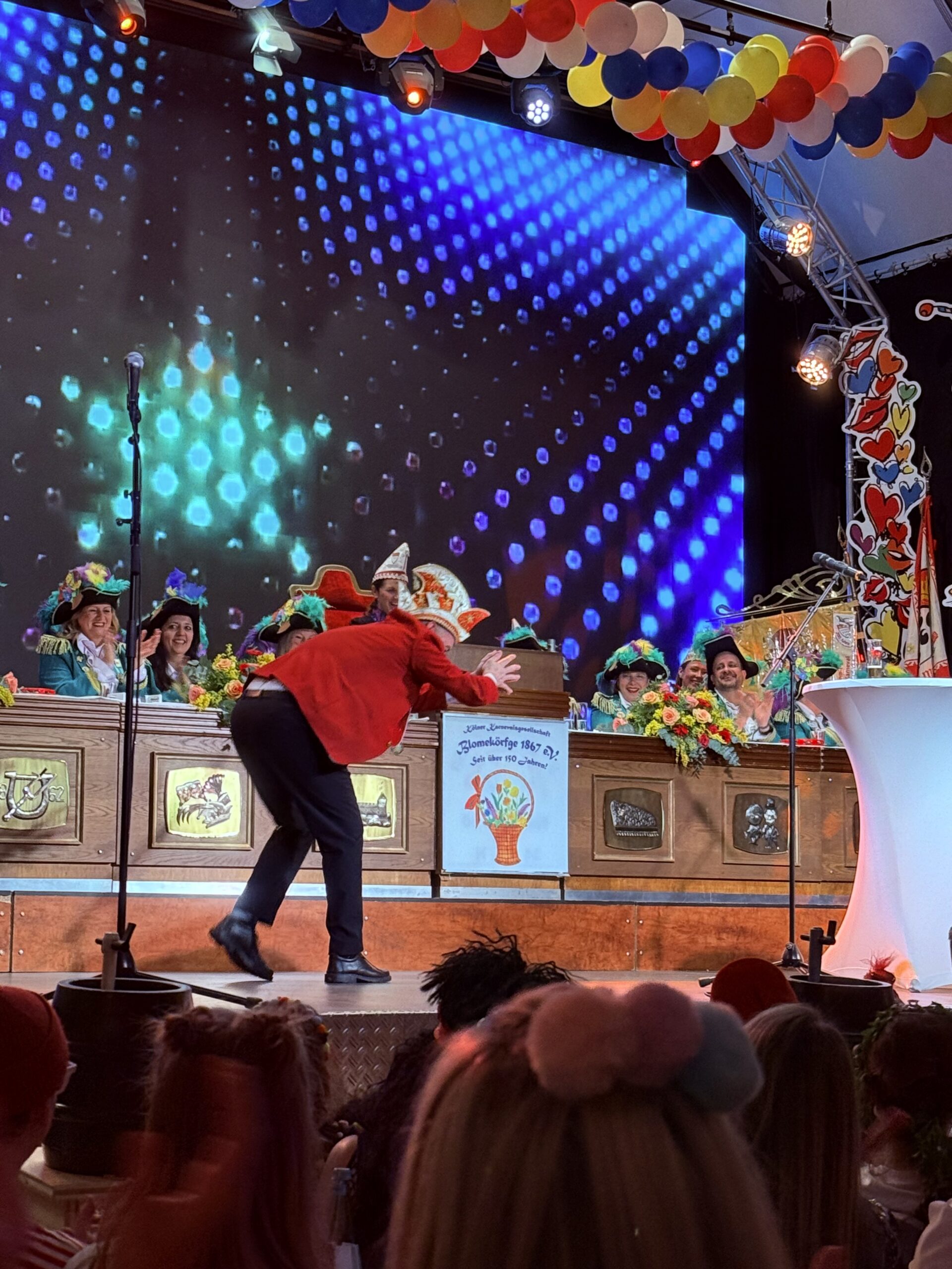 Direkt zu Beginn, als die Bühne zum überwiegenden Teil mit strahlenden Frauen der Damengarde gefüllt war, schaute Herr Sartory doch einmal nach dem Rechten. Nein, Spaß 😉 – er wurde auf die Bühne geholt, da die KG Herrn Sartory zum Ehrenmitglied ernannt hat. Seit 33 Jahren findet die große Kostümsitzungist eine klassische traditionelle Sitzung mit einem bunt gemischtem Bühnenprogramm, zu der alle Gäste kostümiert kommen. More bereits im Sartory statt, und die KG ehrte ihn stellvertretend für seine Familie für die vertrauensvolle Zusammenarbeit. Ein Ehrenmitglied hatte bereits vor 33 Jahren mit Senior Sartory den ersten Vertrag abgeschlossen – und somit feiert das Blomekörfge auch weiterhin im schönen Ostermannsaal.