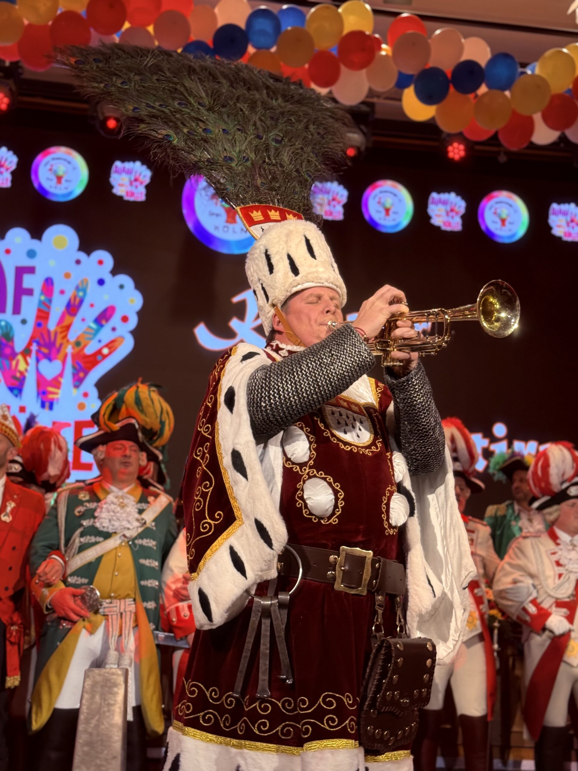 Selbstverständlich verschönerte auch das Schönste, was die Stadt zu bieten hat, jedes Blömche: das Kölner Dreigestirn. Anlässlich des Ostermannsaals sang das Dreigestirn gemeinsam mit dem Saal die schönsten Lieder von Willi Ostermann. Sehr emotional stimmte Bauer Clemens die Jecken mit seiner Trompete ein. Prinz Niklas ermutigte noch einmal alle dazu, wieder mehr Kölsch zu sprechen, damit die Sprache – genauso wie unser Brauchtum – weiterlebt.