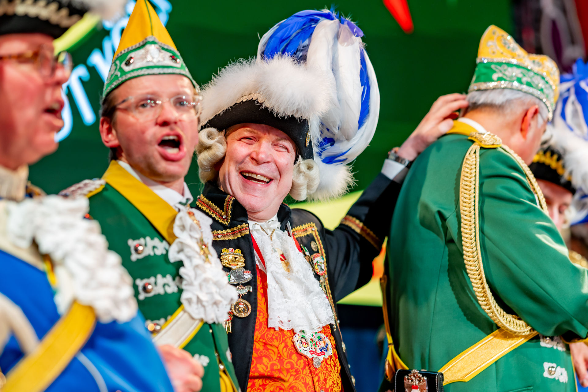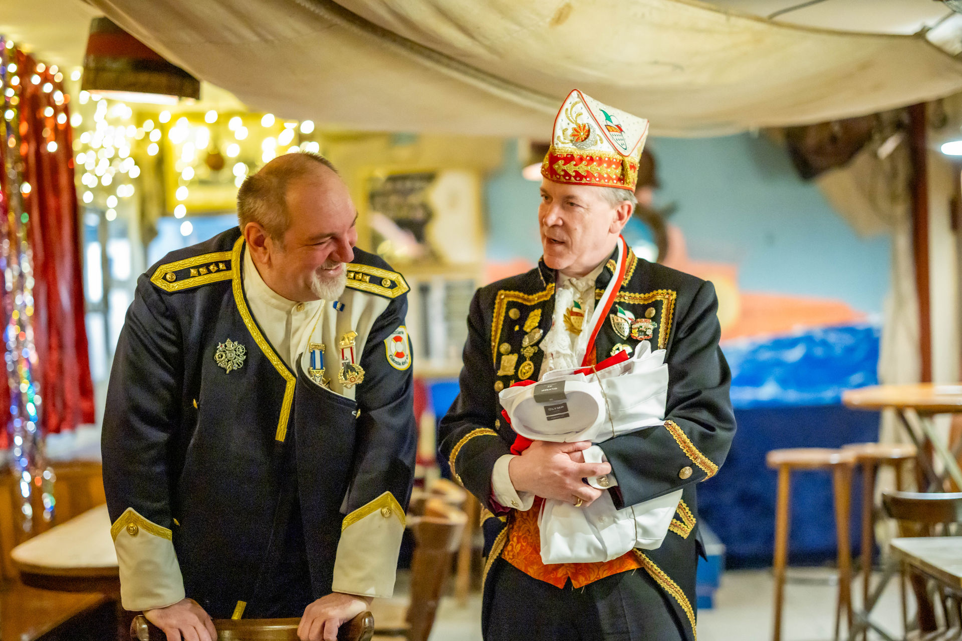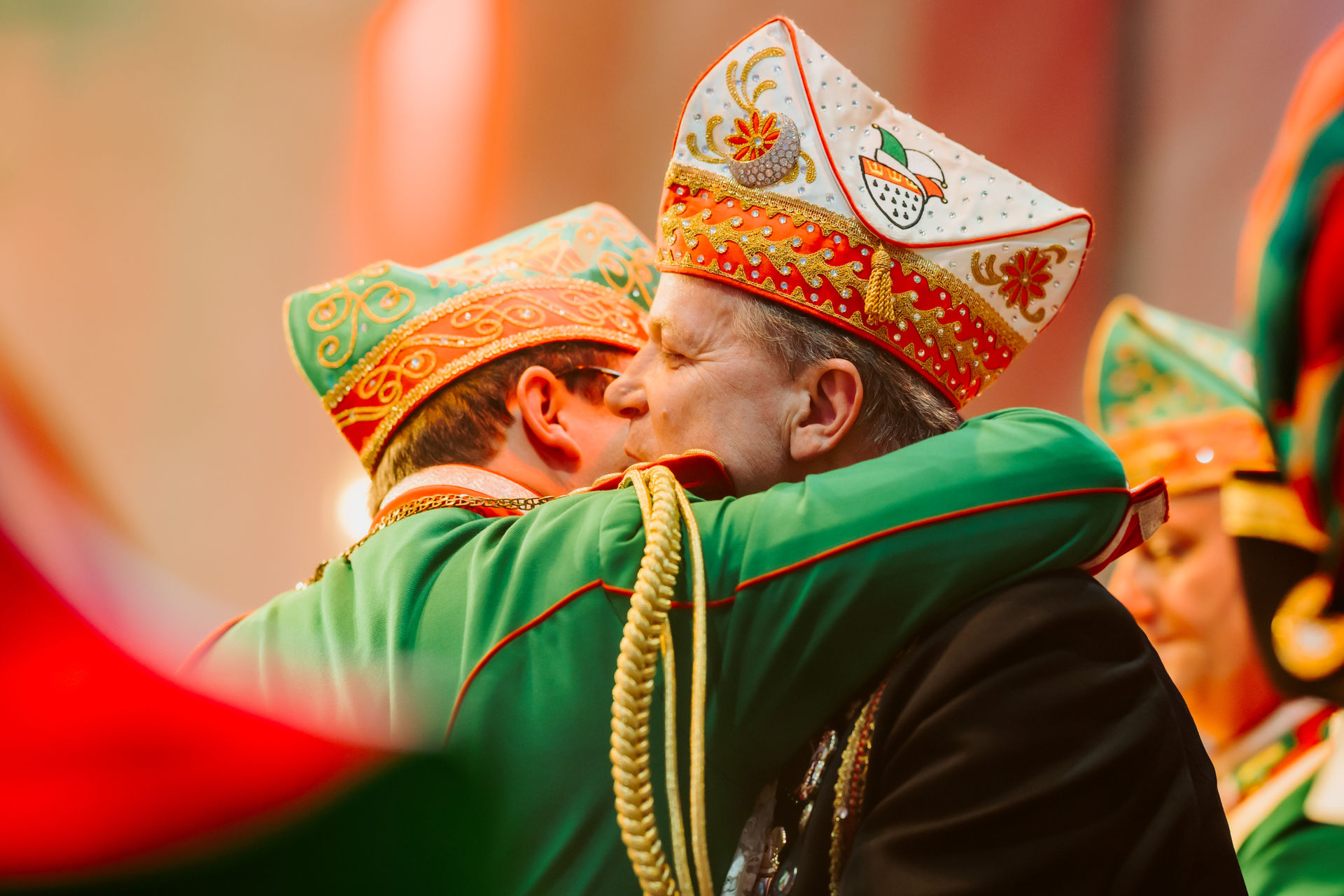Für mich könnte der Tag auch nicht schöner enden, weil ich schon bei Ankunft weiß: Hier wird es schöne Bilder geben, es wird emotional – again. Chris und Björn Griesemann entern den Präsidentenplatz von LUPO Haumann, der vorne steht und das Korps begrüßt. Hüte werden getauscht, Grün-Gelb mischt sich mit Blau-weiß und dazwischen ein über beide Ohren strahlender Chris. Blödsinn machen, das will er in seinen letzten Tagen im Amt ganz besonders. Spaß haben, Freunde treffen, Liebe empfangen und aussenden. Die Bilder sprechen wohl für sich. Wenn erwachsene Männer wieder zu Kindern werden, weil sie mit ihren Freunden rumalbern können, zeigt sich wieder mal die schönste Seite des Karnevals, der oft genug auch ziemlich ernst sein kann.