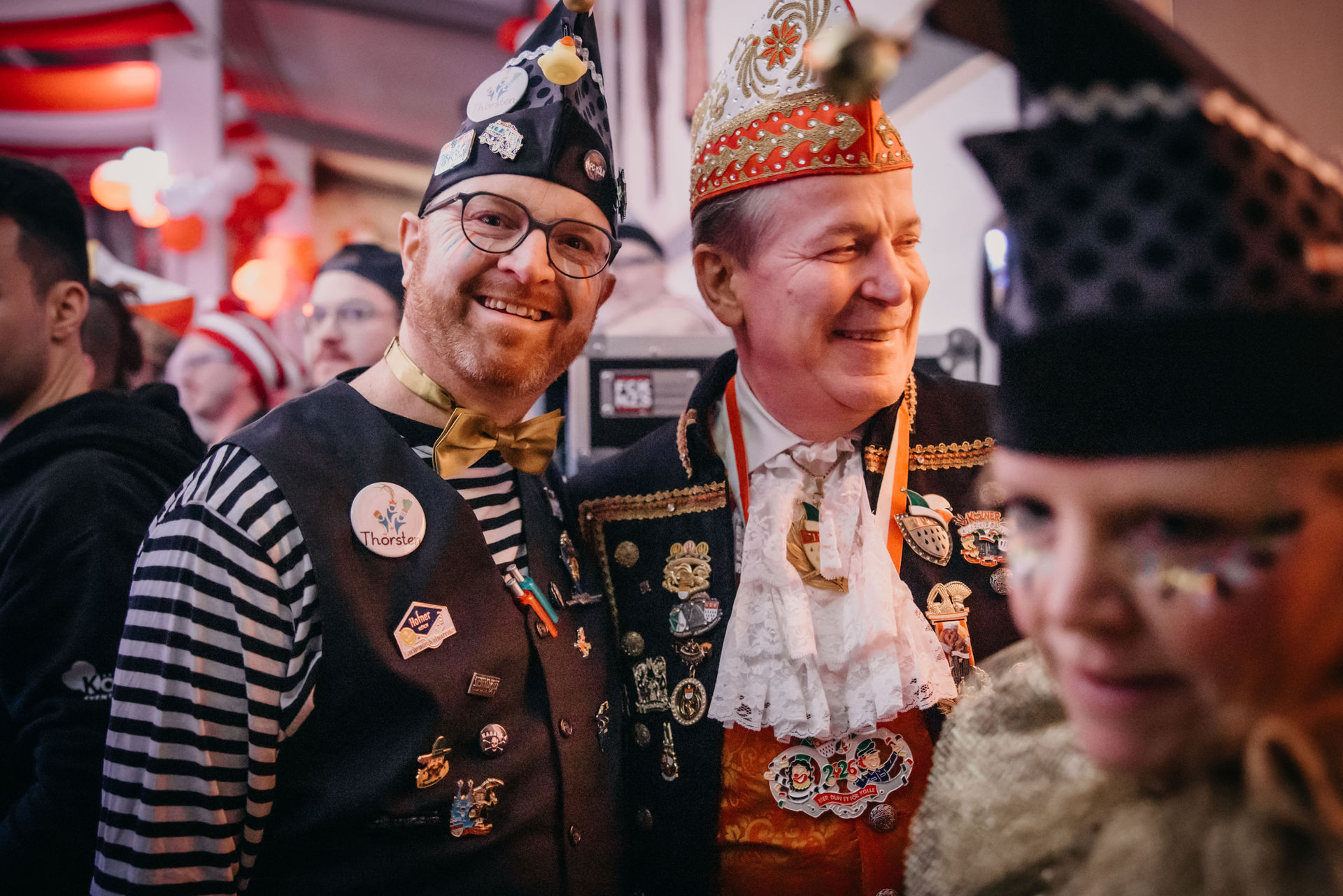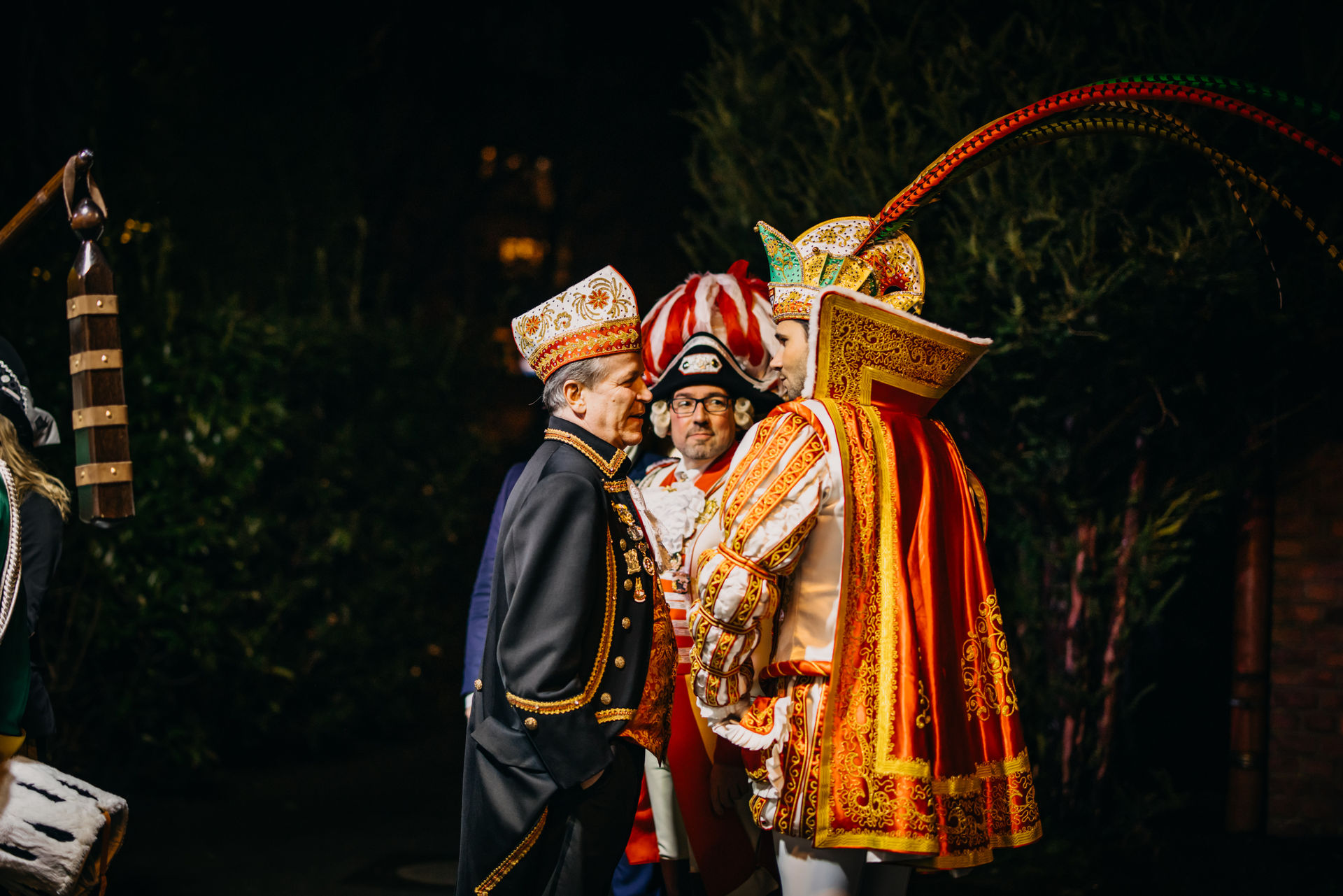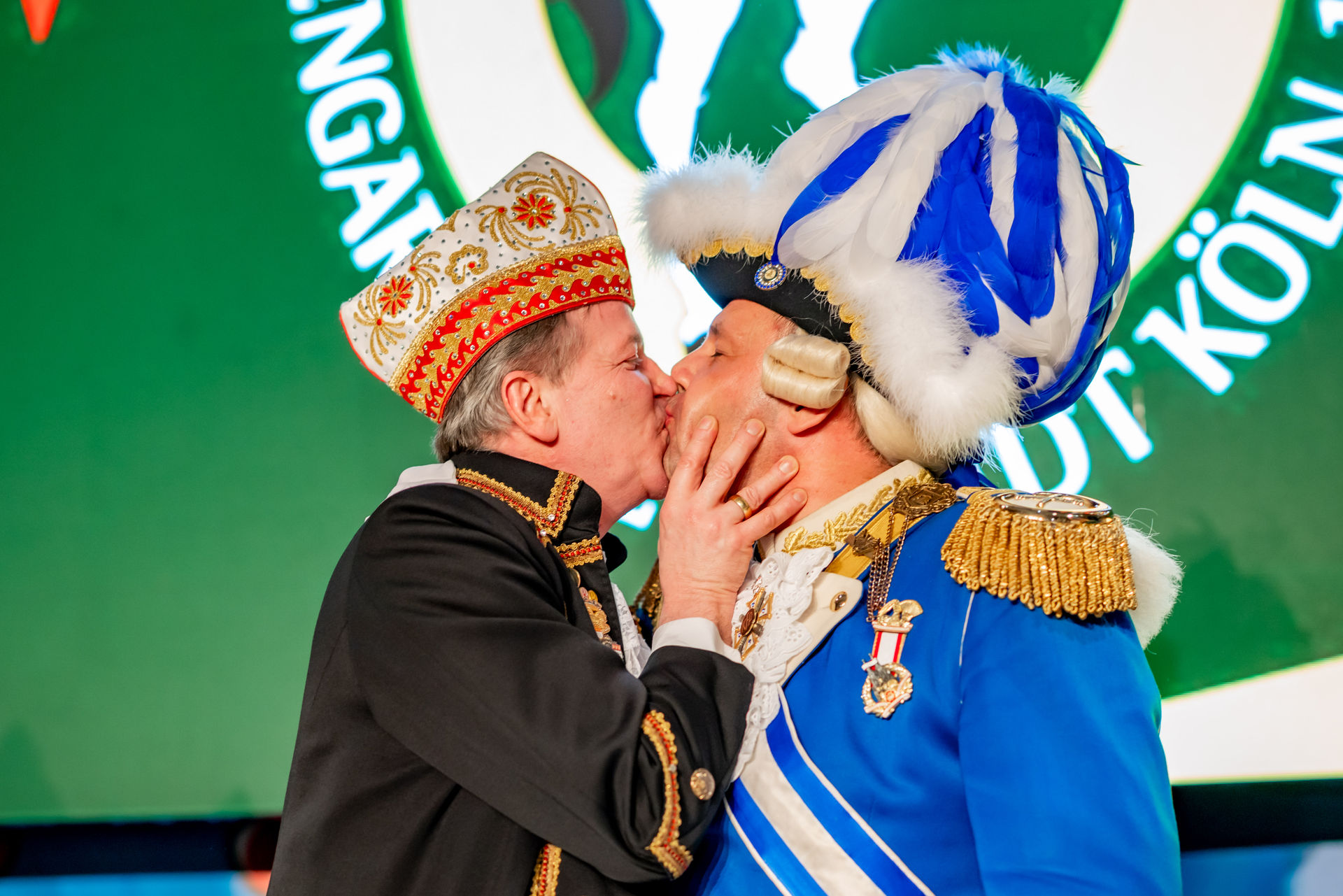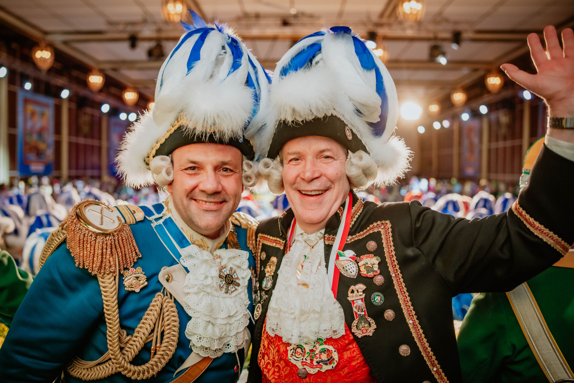 Für mich könnte der Tag auch nicht schöner enden, weil ich schon bei Ankunft weiß: Hier wird es schöne Bilder geben, es wird emotional – again. Chris und Björn Griesemann entern den Präsidentenplatz von LUPO Haumann, der vorne steht und das Korps begrüßt. Hüte werden getauscht, Grün-Gelb mischt sich mit Blau-weiß und dazwischen ein über beide Ohren strahlender Chris. Blödsinn machen, das will er in seinen letzten Tagen im Amt ganz besonders. Spaß haben, Freunde treffen, Liebe empfangen und aussenden. Die Bilder sprechen wohl für sich. Wenn erwachsene Männer wieder zu Kindern werden, weil sie mit ihren Freunden rumalbern können, zeigt sich wieder mal die schönste Seite des Karnevals, der oft genug auch ziemlich ernst sein kann.
