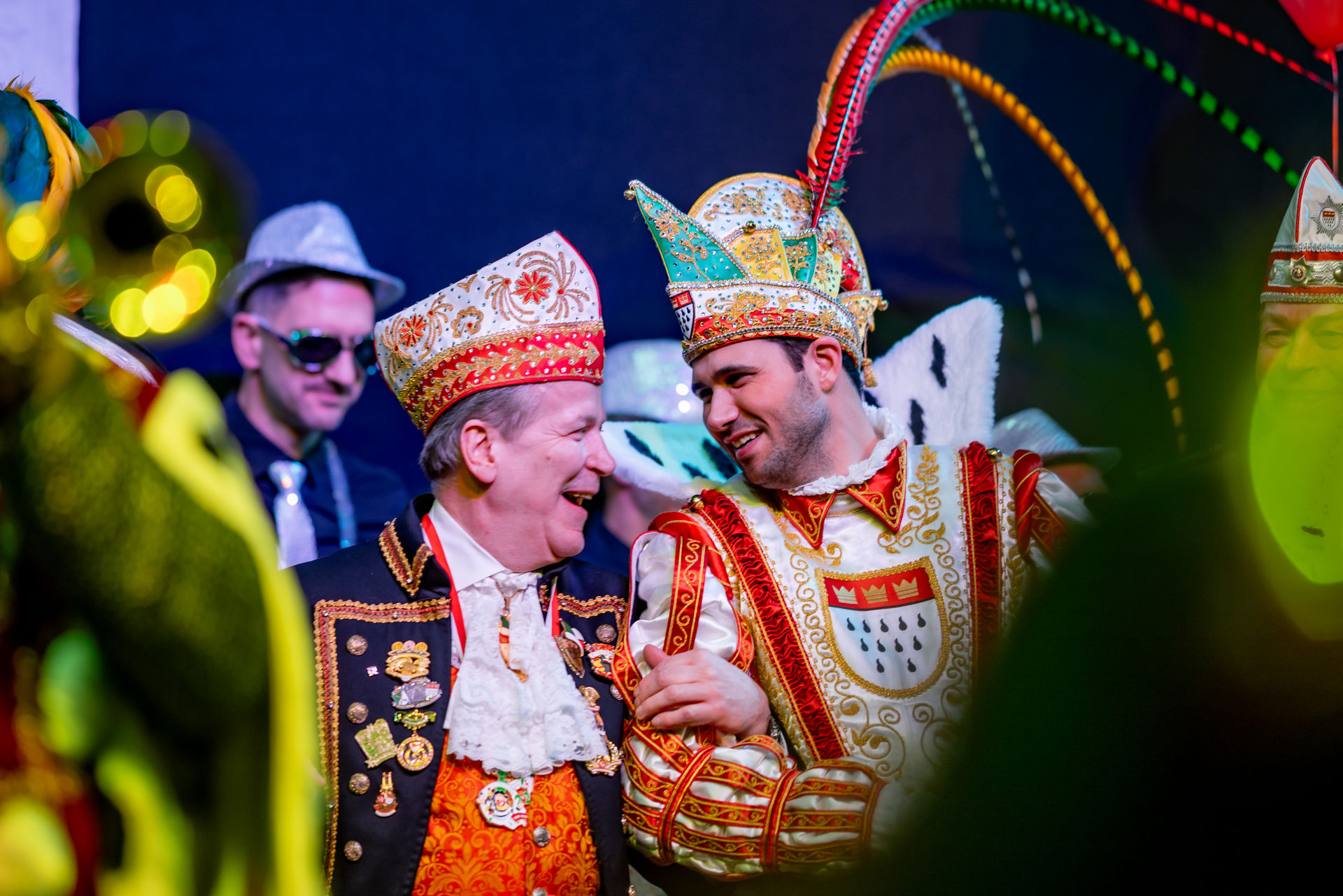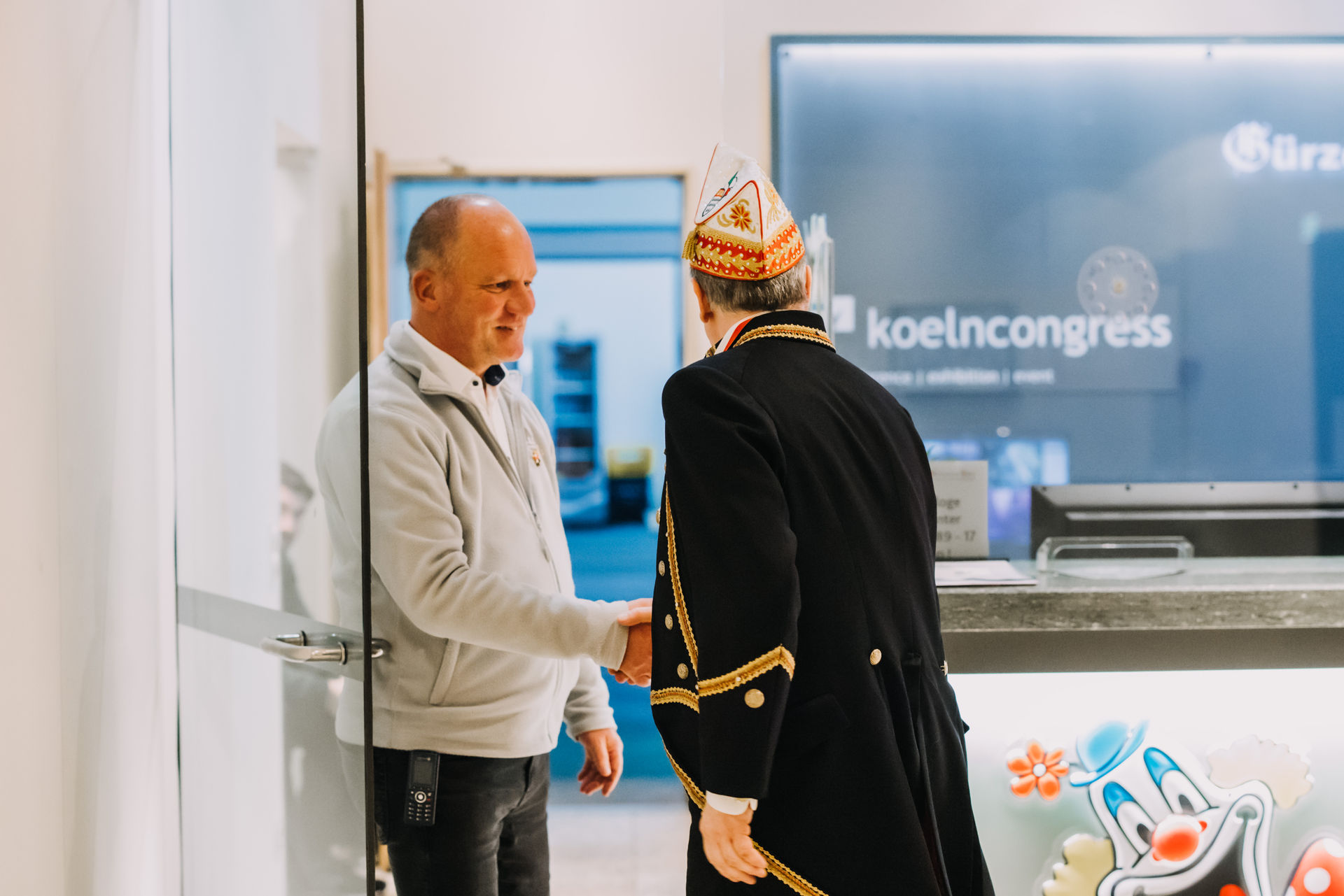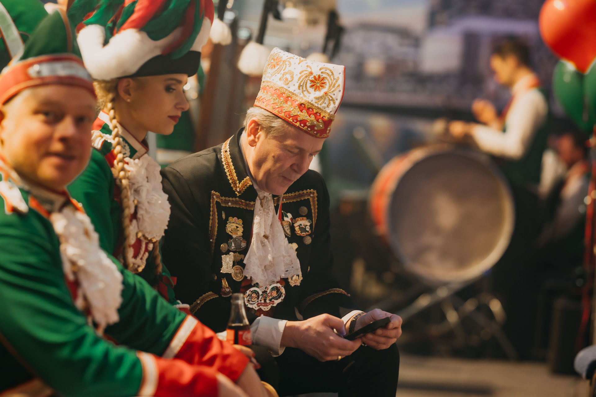 Eigentlich würde er sogar die ganze Sitzungist eine Karnevalsveranstaltung zwischen der Proklamation und Karnevalsdienstag mit einem bunt gemischten Bühnenprogramm: Tanzgruppen und Korpsgesellschaften ziehen in den Saal und präsentieren ihre Tanzkünste, Büttenredner widmen sich mit Witz und Ironie den großen und kleinen Themen der Welt und kölsche Musiker reißen das Publikum von den Stühlen. Highlights sind der Einzug des Dreigestirns und die Ansprache des Prinzen an sein „Narrenvolk“. More bleiben, aber wir wollen auch noch weiter in andere Säle. Die Session ist kürzer als sonst, was ihm eigentlich sehr gefällt, weil die Energie konzentrierter ist, das macht es besonderer und passend für seinen Abschluss. Leider schafft er es so trotz 150-180 Terminen nicht, alle Gesellschaften zu besuchen, um sich zu verabschieden. Er liebt es von Saal zu Saal zu fliegen, nah am „Volk“ zu sein. Neben fixen Terminen entscheidet er gern mal spontan, wo es hingeht.