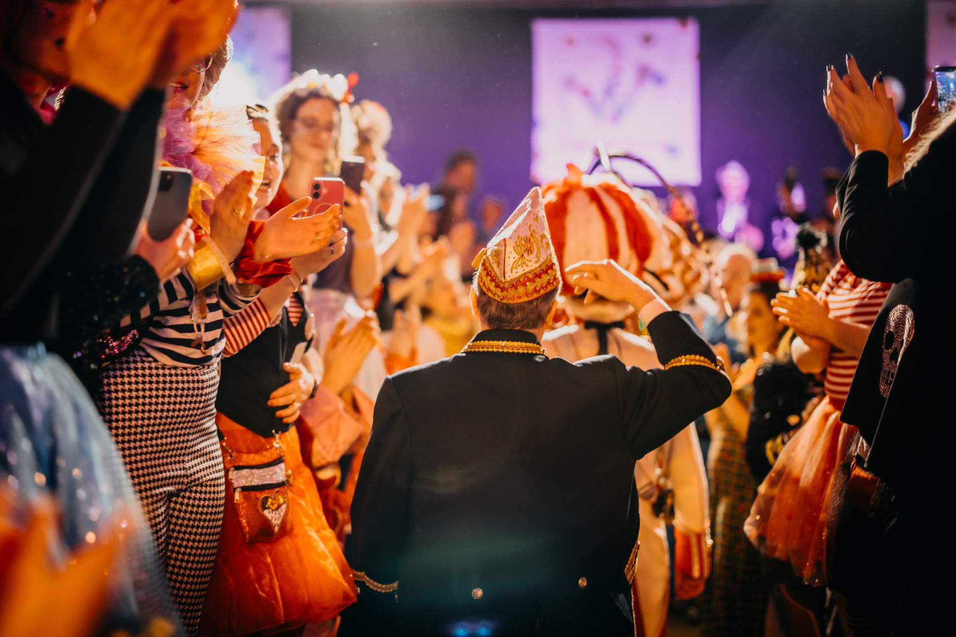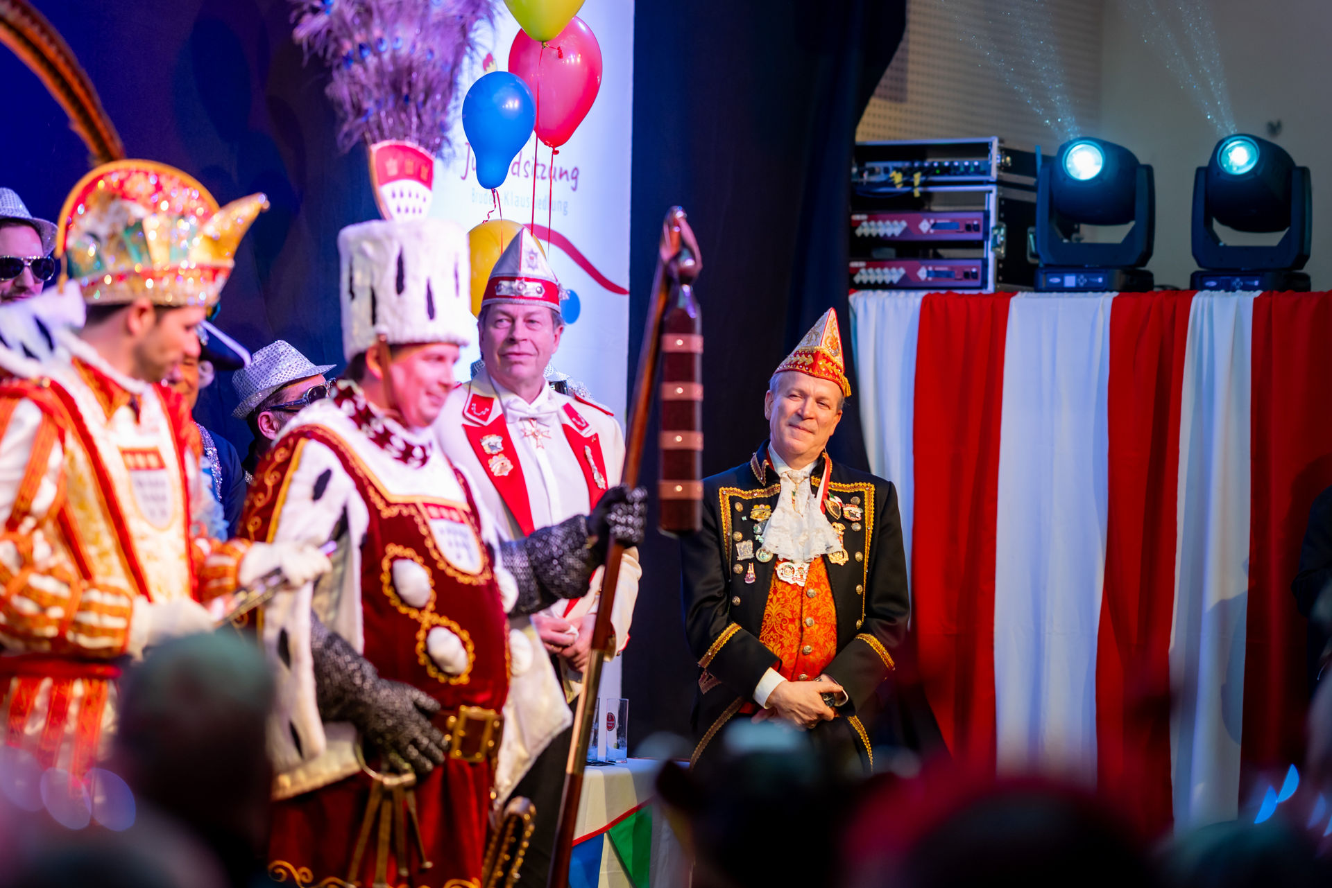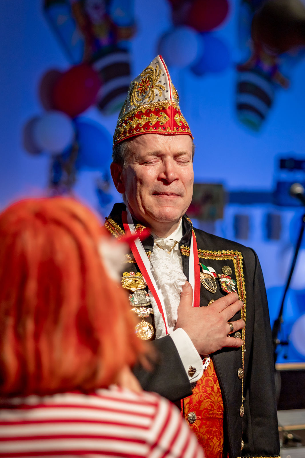 Eigentlich würde er sogar die ganze Sitzungist eine Karnevalsveranstaltung zwischen der Proklamation und Karnevalsdienstag mit einem bunt gemischten Bühnenprogramm: Tanzgruppen und Korpsgesellschaften ziehen in den Saal und präsentieren ihre Tanzkünste, Büttenredner widmen sich mit Witz und Ironie den großen und kleinen Themen der Welt und kölsche Musiker reißen das Publikum von den Stühlen. Highlights sind der Einzug des Dreigestirns und die Ansprache des Prinzen an sein „Narrenvolk“. More bleiben, aber wir wollen auch noch weiter in andere Säle. Die Session ist kürzer als sonst, was ihm eigentlich sehr gefällt, weil die Energie konzentrierter ist, das macht es besonderer und passend für seinen Abschluss. Leider schafft er es so trotz 150-180 Terminen nicht, alle Gesellschaften zu besuchen, um sich zu verabschieden. Er liebt es von Saal zu Saal zu fliegen, nah am „Volk“ zu sein. Neben fixen Terminen entscheidet er gern mal spontan, wo es hingeht.