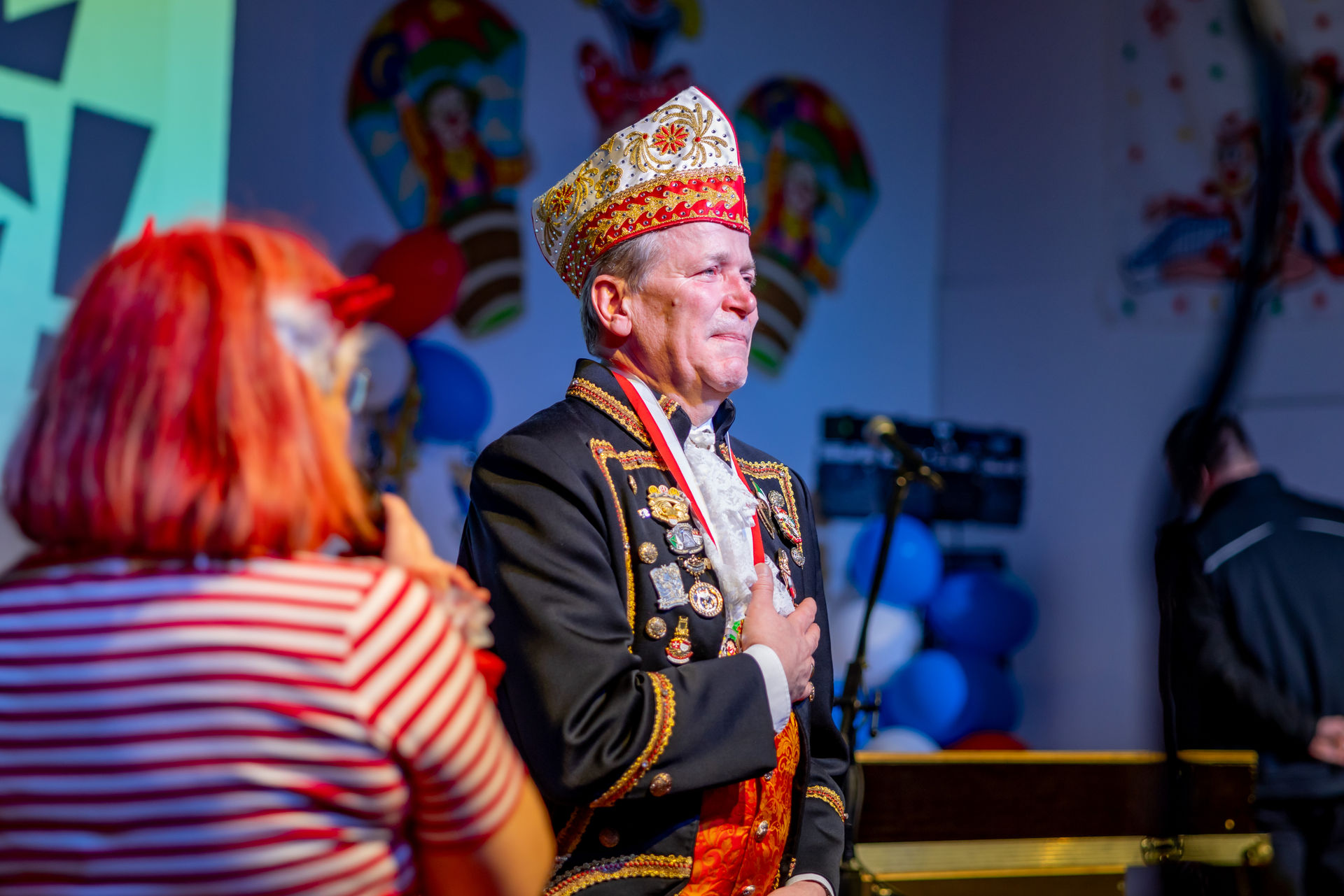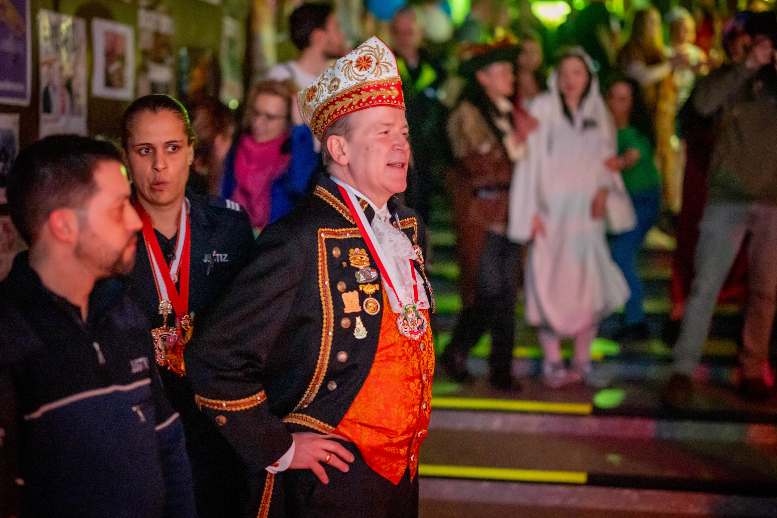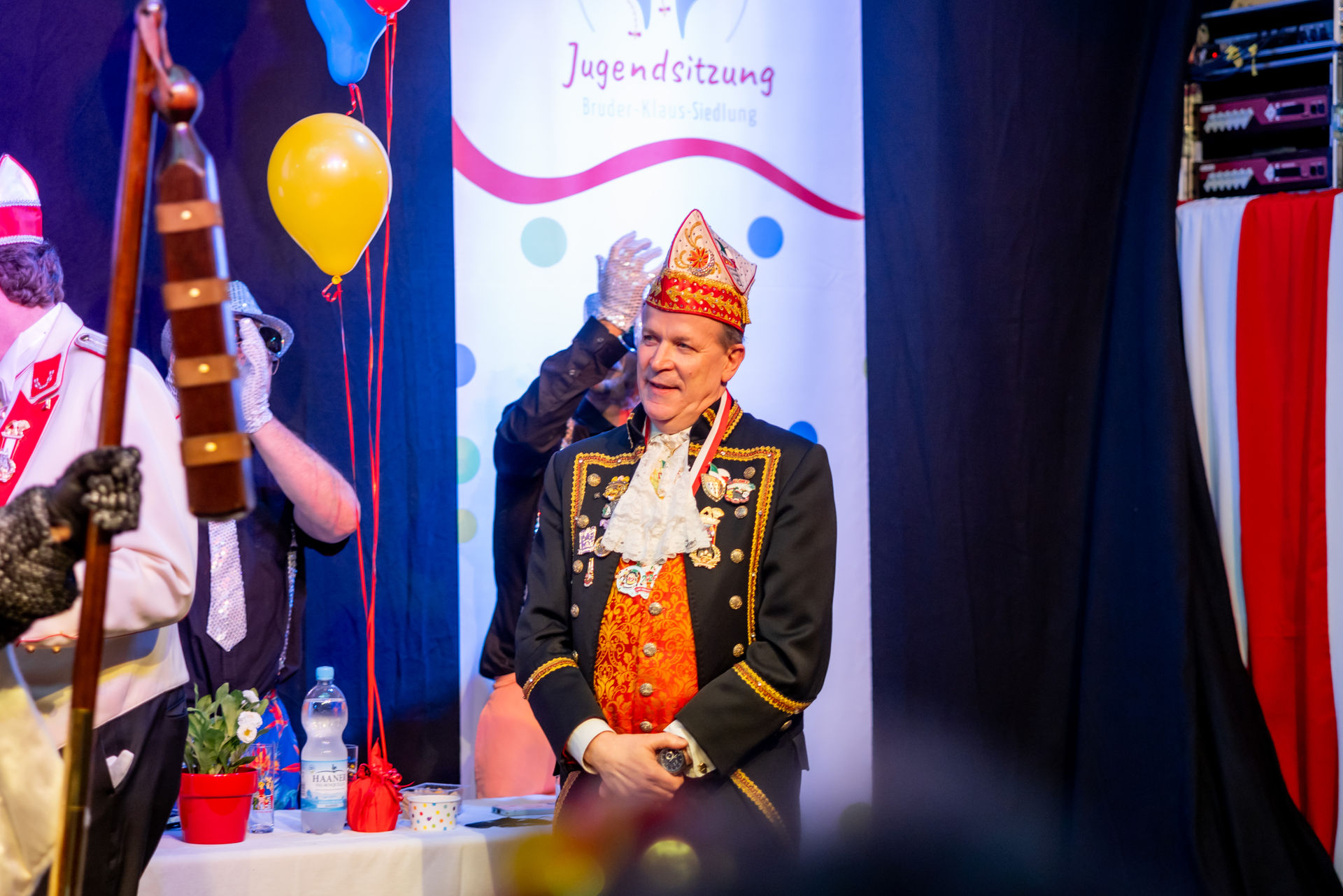 Das Dreigestirn kommt kurz nach uns an. Er hadert, entscheidet sich aber dafür, diesmal mit ihnen auf die Bühne zu gehen. Zieht mit ein, aber stellt sich an den Rand. Schaut sich die Drei mit Stolz an. Eine gute Wahl für sein letztes Dreigestirn. Zum Schunkeln holt die Adjutantur ihn in die Mitte. Die Stimmung im Pfarrsaal ist urig, kölsch, jung, gelöst. Abzug von der Bühne, noch ein paar Selfies mit Leuten aus dem Publikum und raus. Er wirkt entspannter. Das sind die Veranstaltungen mit Herz und Seele, die ihn glücklich machen.