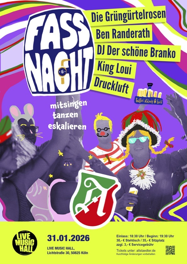18:45 VeranstalterAltstädter Köln 1922 eVLive Music Hall, Lichtstr. 30, 50825 Köln-Ehrenfeld31jan18:45Fassnacht - die neue Party für die junge kölsche Generationder Altstädter Köln 1922 e. V.