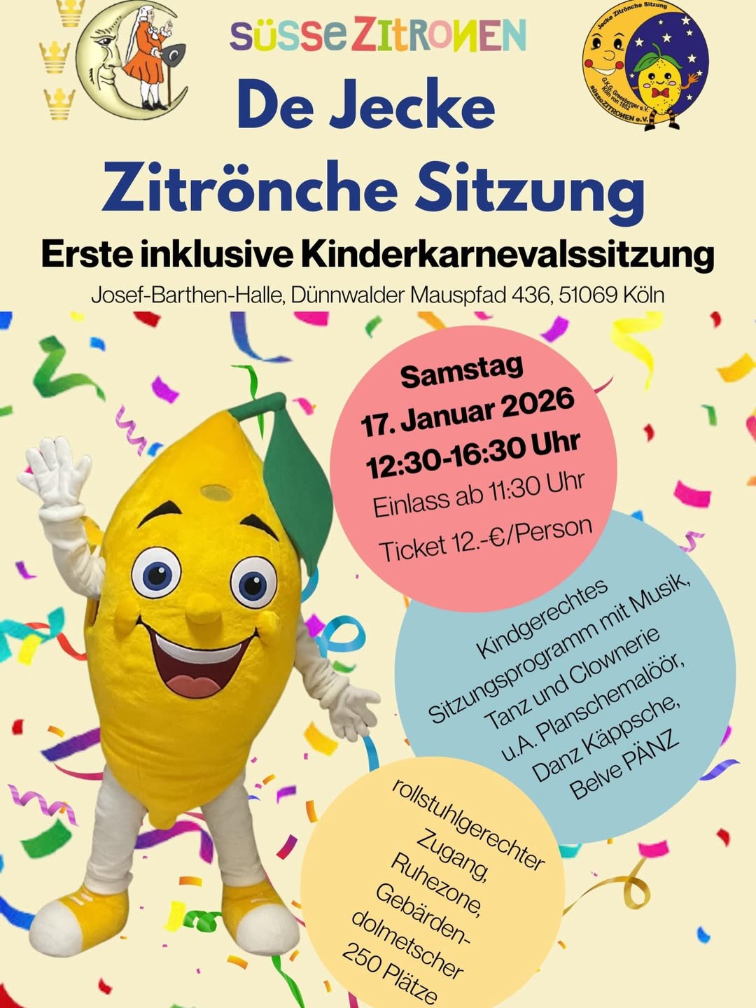 12:30 VeranstalterKD RheinschifffahrtJosef-Barten-Halle – Schützenheim Dünnwald, Dünnwalder Mauspfad 43617jan12:30Jecke Zitrönche Sitzung (Erste inklusive Kindersitzung)