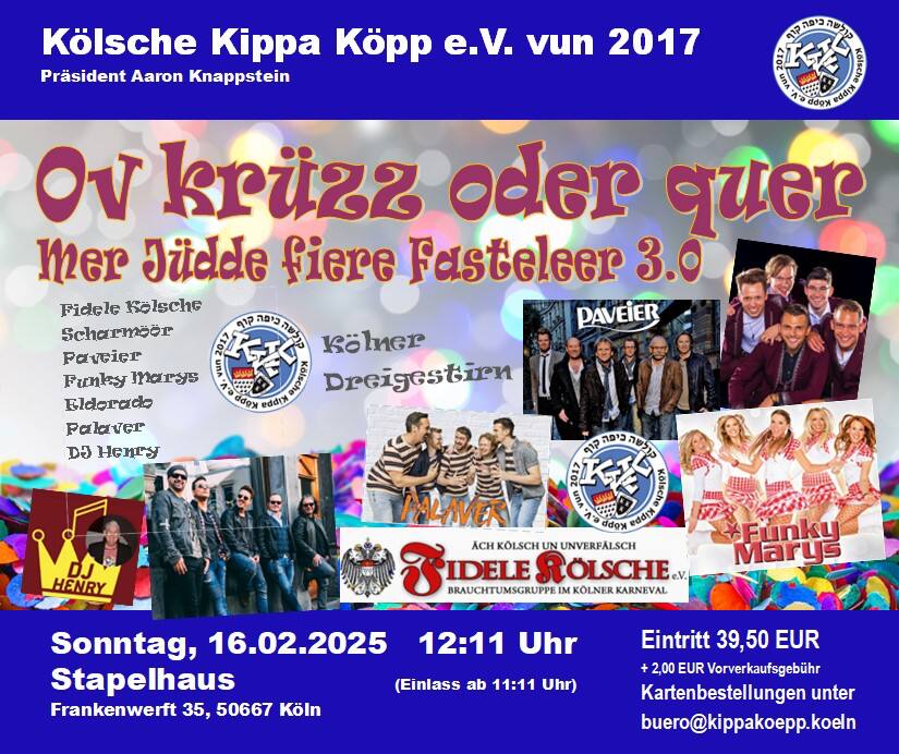 12:11 VeranstalterKölsche Kippa Köpp e.V. vun 2017Dom im Stapelhaus, Frankenwerft 3501feb12:11Ov krüzz oder quer – Mer Jüdde fiere Fasteleer 4.0der Kölschen Kippa Köpp