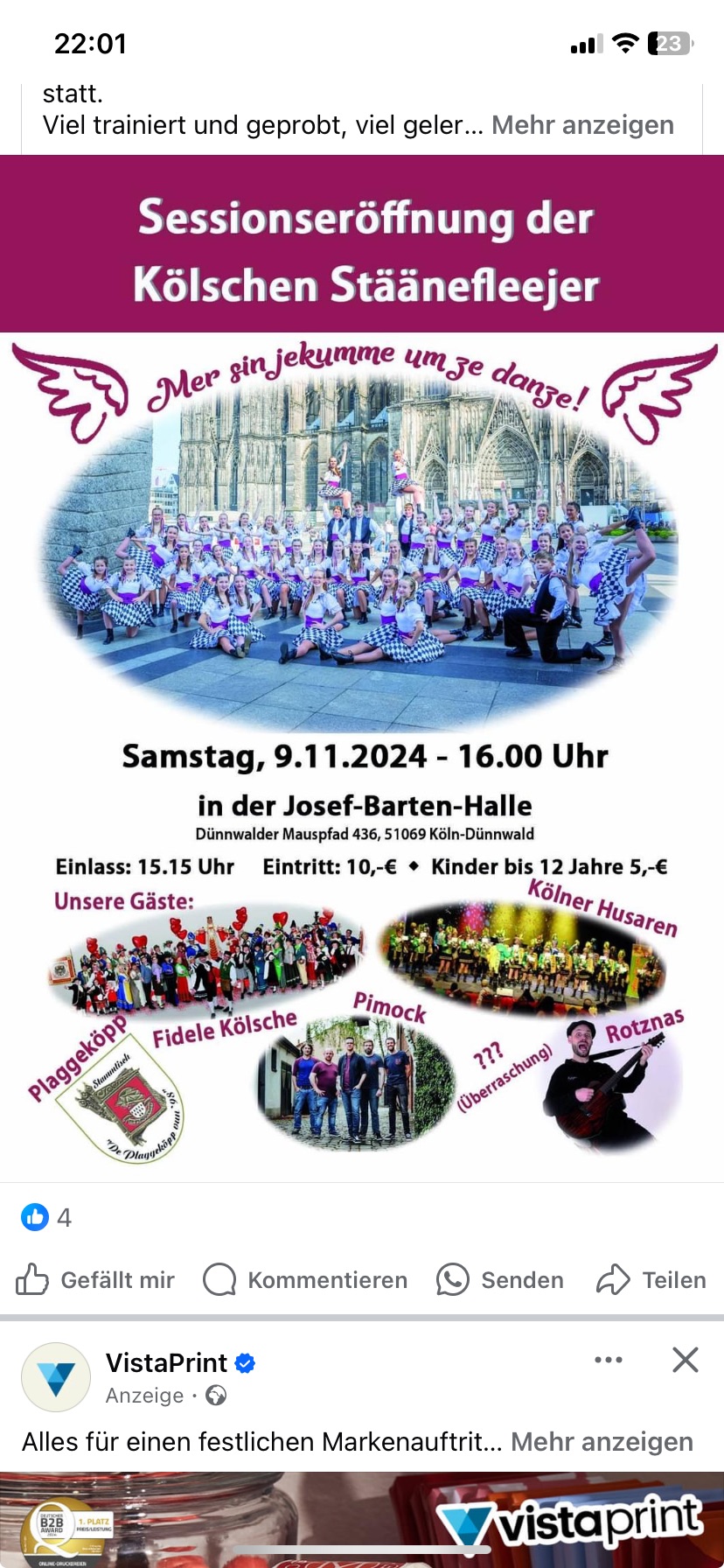 16:00 VeranstalterKölsche-Stäänefleejer e.V.Josef-Barten-Halle – Schützenheim Dünnwald, Dünnwalder Mauspfad 43608nov16:00Sessionseröffnung der Kölschen Stäänefleejer