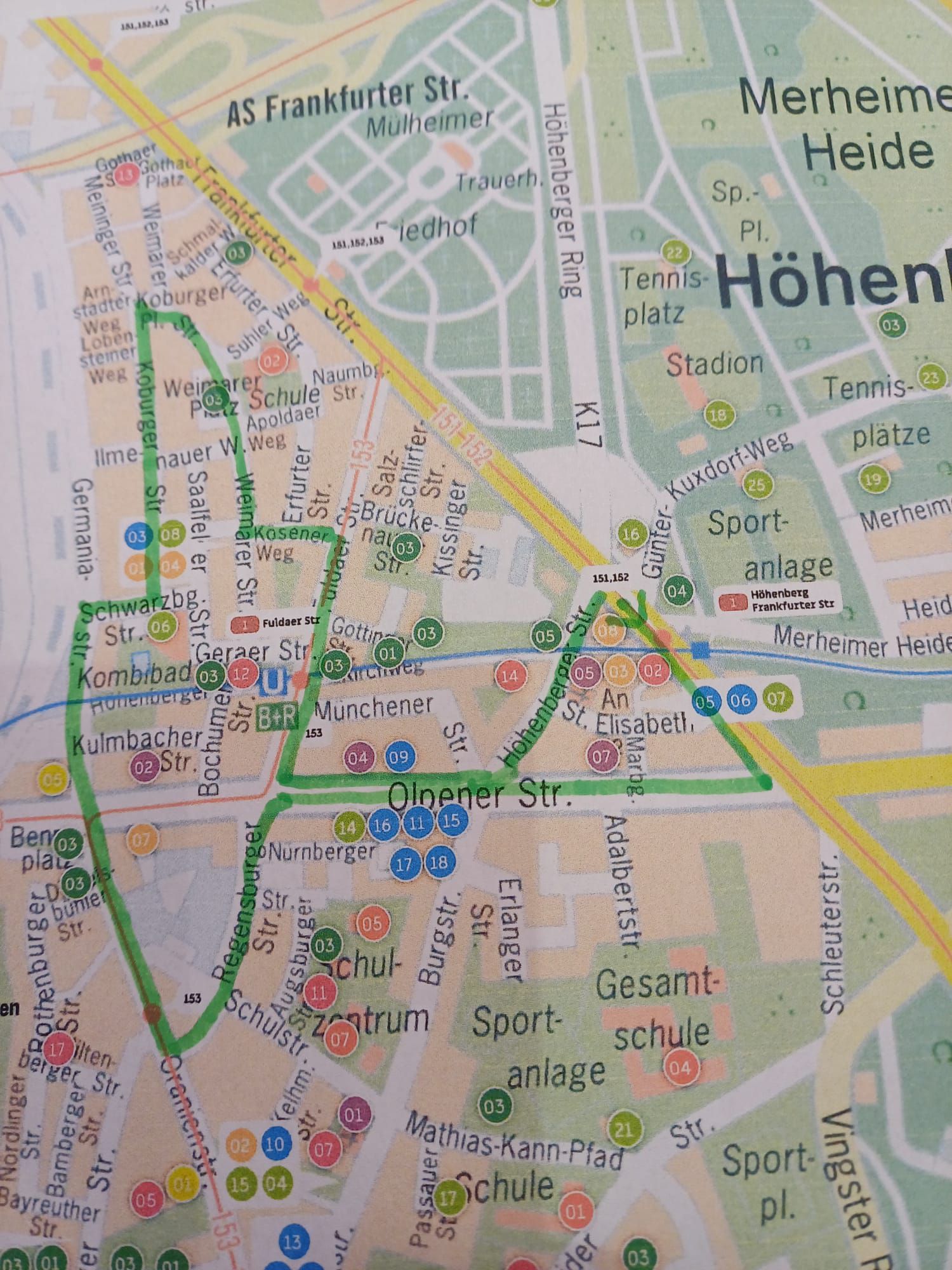 Zugweg: Frankfurter Straße – Olpener Straße – Germaniastraße – Schwarzburger Straße – Koburger Straße – Koburger Platz – Weimarer Straße – Kösener Weg – Erfurter Straße – Naumburger Straße – Fuldaer Straße – Olpener – Höhenberger Straße – Frankfurter Straße