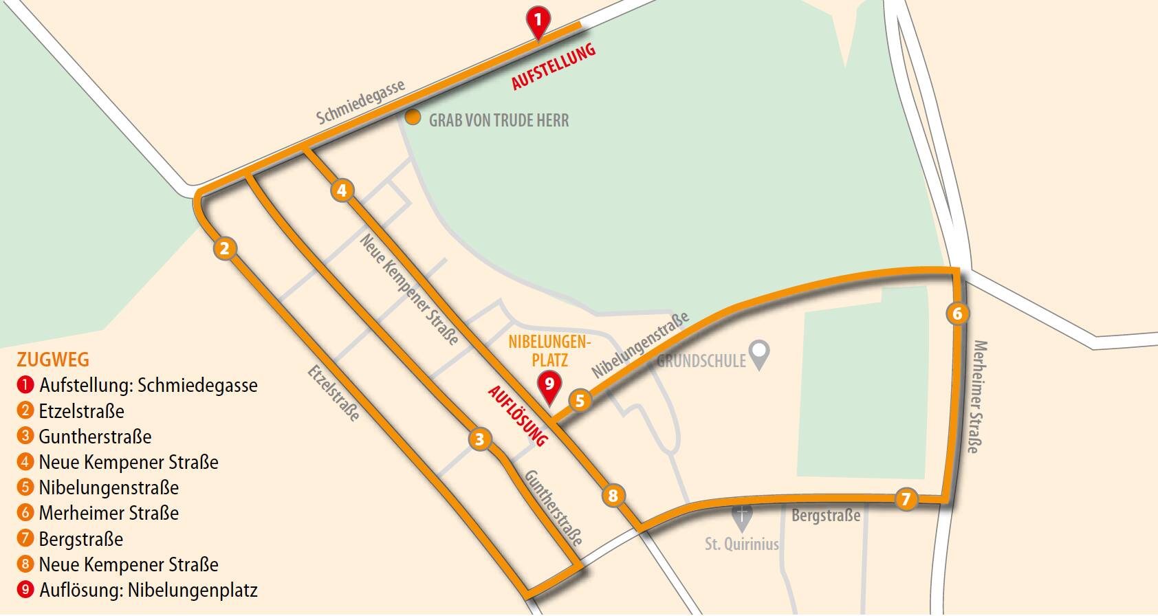 Zugweg: Etzelstr. – Bergstr. – Guntherstr. – Schmiedegasse – Neue Kempener Str. – Niebelungenstr. – Merheimer Str. – Theklastr. – Grüner Hof – Friedrich-Karl-Str. – Merheimer Str. – Bergstr. –