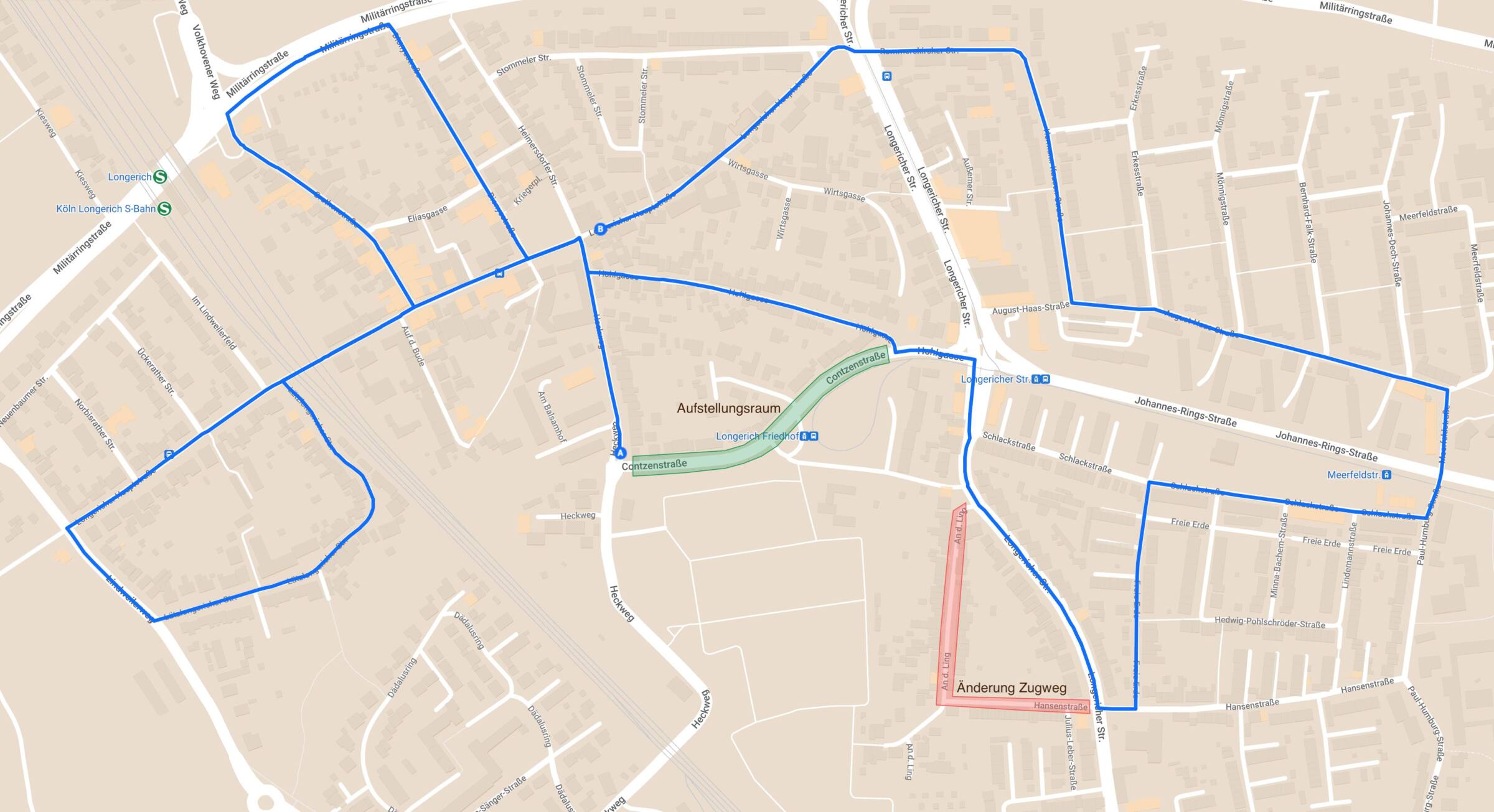 Zugweg: Maria-Himmelfahrt-Straße – Schnellweider-Straße – Andersenstraße – Drosselbartstraße – Wasserwerkstraße – Piccoloministraße – Zugauflösung am Seniorenzentrum St. Anno
