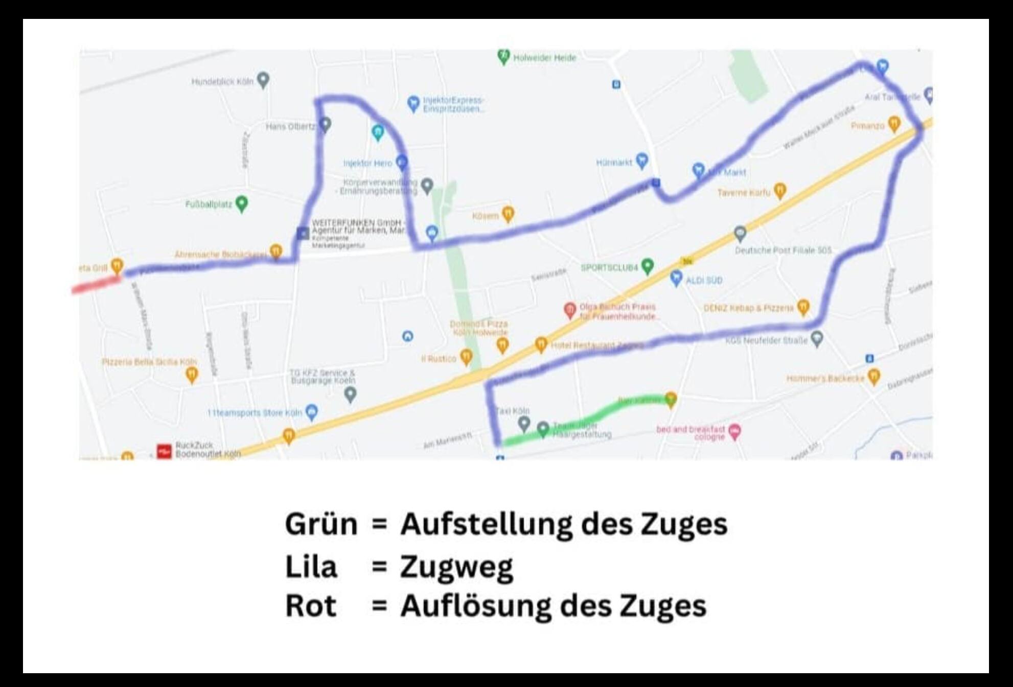 Zugweg: Maria-Himmelfahrt-Straße – Schnellweider-Straße – Andersenstraße – Drosselbartstraße – Wasserwerkstraße – Piccoloministraße – Zugauflösung am Seniorenzentrum St. Anno
